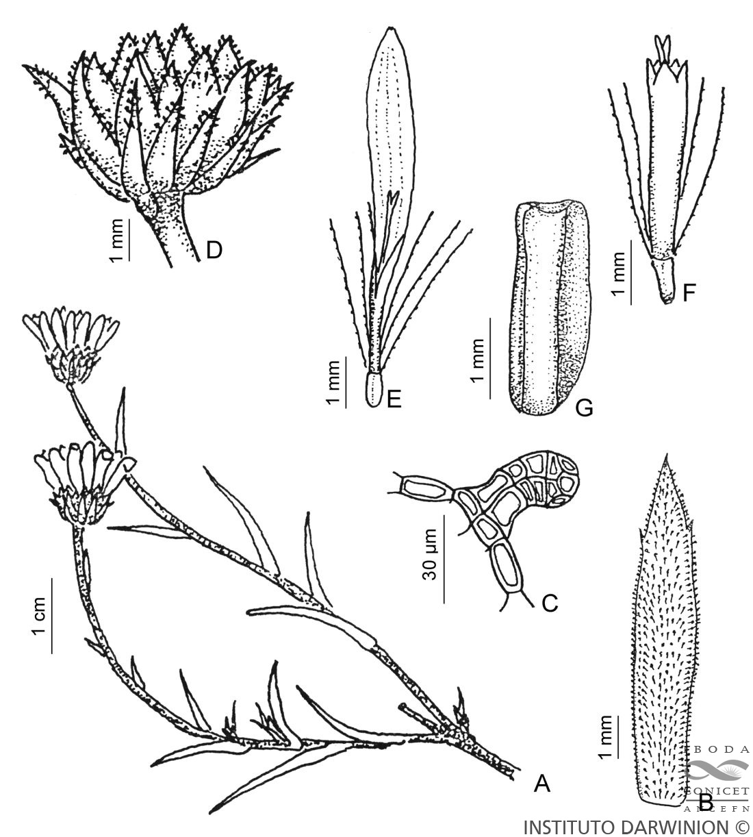 Subarbustos hasta de 20 cm de alto. Tallos leñosos, postrados, radicantes, de cuyos nudos nacen tallos herbáceos ascendentes, cubiertos densamente por tricomas glandulares estipitados, con ramitas ascendentes, hojosas hasta el ápice. Hojas sésiles y envainadoras, lineares, de 10-40 × 1-3 mm, ápice agudo mucronado, margen entero o dentado, cuando dentado dientes terminados en aristas rígidas curvas, con pubescencia densa en ambas caras formada por tricomas glandulares estipitados y escasos tricomas simples. Capítulos radiados, de 10-15 mm de diámetro. Involucro hemisférico, de 4-6 × 6-7 mm, con filarios en 4 series desiguales, los externos angostamente triangulares, de 2-2,5 × 0,5-1 mm, acuminados, con tricomas glandulares estipitados en toda su superficie; los internos elípticos, de 4-5 × 1-1,5 mm, acuminados, con tricomas glandulares estipitados en la porción distal. Flores dimorfas, las marginales con corola ligulada, con limbo linear elíptico, entero a 3-dentado, de 5-8 × 1,2-1,5 mm; las del centro con corola tubulosa de 4 mm de largo. Aquenios prismáticos, de 2,5 mm de largo. Papus formado por 4-8 aristas capilares, subcilíndricas, de 3-3,5 mm de largo.