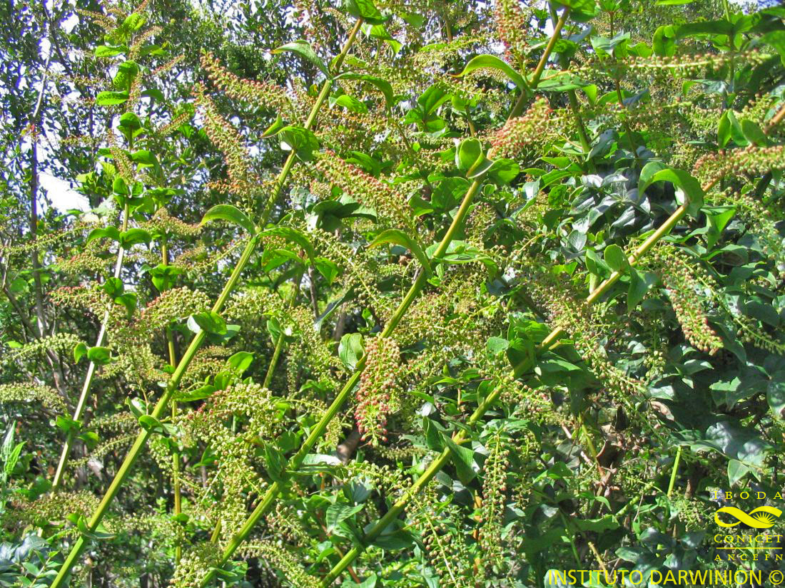 Arbustos de 0,6-3 m de alto, con tallos longitudinalmente estriados o brevemente alados. Hojas opuestas, subopuestas o en verticilos 3-meros, subsésiles, ovadas a elípticas, de 3-8 × 1-4 cm, base redondeada a ligeramente cordada, ápice agudo a acuminado, margen entero, apéndices estipulares numerosos, glandulosos, semejantes a pelos carnosos rojizos. Inflorescencias en racimos axilares, de 9-20 cm de largo; pedúnculos bracteados o ebracteados. Flores perfectas; pedicelos de 3,5-6 mm de largo, con brácteas linear-lanceoladas, de 3-7 × 0,5-0,8 mm, acuminadas, de margen hialino y eroso; sépalos ovados, de 1,5-2 × 0,9-1,5 mm, cóncavos, subcarnosos, internamente carinados, de margen hialino y ápice eroso; pétalos ovados o lanceolados, de 0,9-1,2 × 0,4-0,8 mm, internamente carinados, el margen igual que los sépalos, carnosos, todos desarrollados o 1-2 abortados; estambres libres, filamentos filiformes, de 0,5-0,7 mm de largo, anteras de 1-1,8 mm de largo, densamente papilosas; ovario subgloboso, de 0,7-1 × 0,4-0,5 mm; estilo grueso, de 1,5-3 mm de largo, densamente papiloso, rojizo. Fruto compuesto por 5 aquenios de 1,6-1,8 mm de largo, fuertemente nervados, rodeados por el cáliz y la corola acrescentes, violáceos.