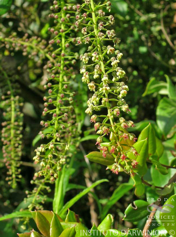 Arbustos de 0,6-3 m de alto, con tallos longitudinalmente estriados o brevemente alados. Hojas opuestas, subopuestas o en verticilos 3-meros, subsésiles, ovadas a elípticas, de 3-8 × 1-4 cm, base redondeada a ligeramente cordada, ápice agudo a acuminado, margen entero, apéndices estipulares numerosos, glandulosos, semejantes a pelos carnosos rojizos. Inflorescencias en racimos axilares, de 9-20 cm de largo; pedúnculos bracteados o ebracteados. Flores perfectas; pedicelos de 3,5-6 mm de largo, con brácteas linear-lanceoladas, de 3-7 × 0,5-0,8 mm, acuminadas, de margen hialino y eroso; sépalos ovados, de 1,5-2 × 0,9-1,5 mm, cóncavos, subcarnosos, internamente carinados, de margen hialino y ápice eroso; pétalos ovados o lanceolados, de 0,9-1,2 × 0,4-0,8 mm, internamente carinados, el margen igual que los sépalos, carnosos, todos desarrollados o 1-2 abortados; estambres libres, filamentos filiformes, de 0,5-0,7 mm de largo, anteras de 1-1,8 mm de largo, densamente papilosas; ovario subgloboso, de 0,7-1 × 0,4-0,5 mm; estilo grueso, de 1,5-3 mm de largo, densamente papiloso, rojizo. Fruto compuesto por 5 aquenios de 1,6-1,8 mm de largo, fuertemente nervados, rodeados por el cáliz y la corola acrescentes, violáceos.
