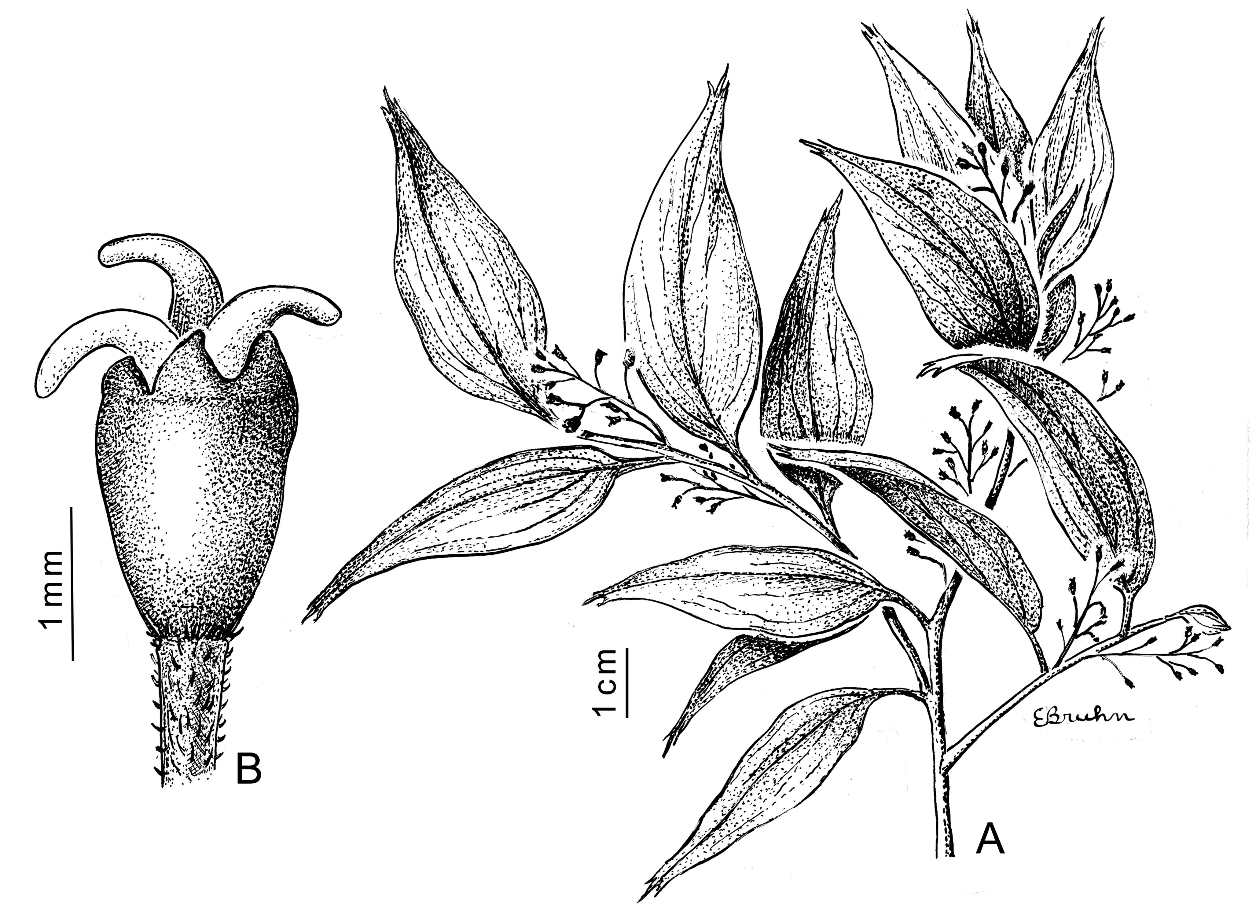 Arbustos hasta de 1 m de alto, rizomatosos, ramificados, generalmente apoyantes o epífitos; ramas viejas glabras, corteza clara, agrietada, las jóvenes amarillentas, cubiertas de cortos pelitos curvados. Hojas con pecíolos de 3-10 mm de largo, subglabros o cortamente pubescentes; láminas de 2,8-7,5 × 1-3,1 cm, ovadas, ovado-lanceoladas o lanceoladas, a veces asimétricas, glabras, con 3-5 nervios arqueados que nacen de la base, el central llegando al ápice, los laterales desvaneciéndose en el tercio superior, marginada, levemente revoluta, coriácea, discolora, cara adaxial verde oscura, brillante, la abaxial más clara y opaca, ápice 3-cuspidado, a veces entero o raro con 2 ó 4 dientes. Inflorescencias de 2-7 cm, las estaminadas más largas que las pistiladas, en panículas axilares; brácteas y bractéolas pequeñas, efímeras. Flores muy pequeñas, verdosas o violáceas, pedicelos pubescentes, articulados; cáliz reducido a 5 dientes ca. 0,3 mm de largo; flores estaminadas con pétalos de 1-1,7 mm de largo; estambres de igual largo que la corola, nectario central aplanado; flores pistiladas apétalas, ovario infero, estilos 3, de 0,5-0,9 mm, recurvados. Fruto una baya elipsoide, de 3-5 mm, violácea, pruinosa, con los estilos persistentes, 1-seminada. Semilla de 3-3,5 mm, negra, rugosa.