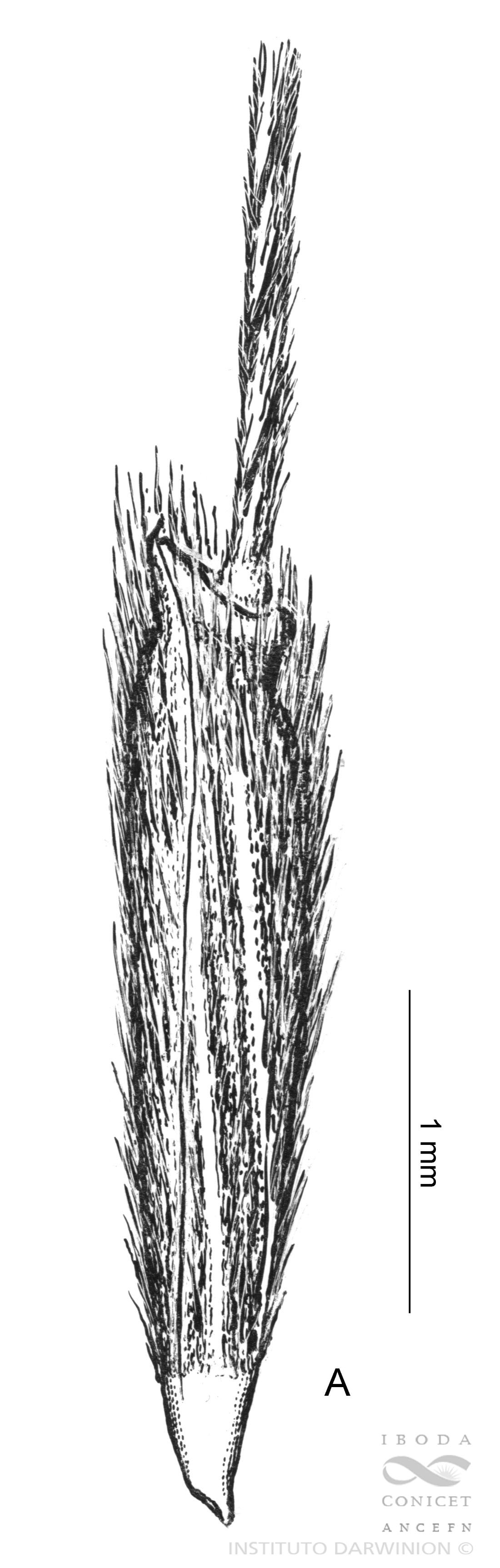 Plantas perennes, densamente cespitosas, de (10-)30-45(-55) cm de alto; cañas cilíndricas, de 0,6-0,8 mm de diámetro, erguidas, rectas, simples, paucinodes; nudos comprimidos, rojizos, glabros; entrenudos longitudinalmente estriados, glabros, pubérulos por debajo de los nudos; vainas foliares estriadas, pubérulas, menores que los entrenudos, con cuello y lóbulos vilosos, márgenes glabros; lígulas truncadas, ca. 0,5 mm de largo, membranáceas, con margen levemente ciliolado, glabras; láminas foliares lineares, convolutas o planas, rígidas, de (2-)12-15 cm x (0,3-)1,8-2 mm, ambas caras estriadas, hipofilo pubérulo, epifilo viloso. Inflorescencias erguidas, pauci o plurifloras, contraídas o extendidas, de (4-)12-20 cm de largo, con ramas adpresas; raquis glabro, ramificaciones y pedicelos ligeramente hispídulos. Espiguillas fusiformes, de 4-5,5 mm de largo; glumas subiguales, de (2,5-)4-5,5 mm de largo, mayores que el antecio, agudas a cortamente atenuadas, membranáceas, glabras a levemente hispídulas hacia la base y sobre el nervio medio, 3-nervias; lemma cilíndrica, de 2-3 x 0,5-0,6 mm de diámetro, muy finamente estriada, con pelos adpresos, dispersos en toda la superficie, los superiores sobrepasando la corona en 0,5-0,7 mm; corona conspicua, ca. 0,2 mm de alto, blanquecina o pajiza, glabra, puntiaguda, ligeramente más ancha y con escasos pelos en la zona de cierre de la lemma; arista suavemente 2-geniculada, de 0,5-0,8 cm de largo, hispídula en la base, luego escabriúscula, grácil, caediza; antopodio subagudo, de 0,2-0,3 (-0,5) mm de largo, glabro o con muy escasos pelos cortos; pálea de 1,1- 1,2 mm de largo, aguda, glabra.