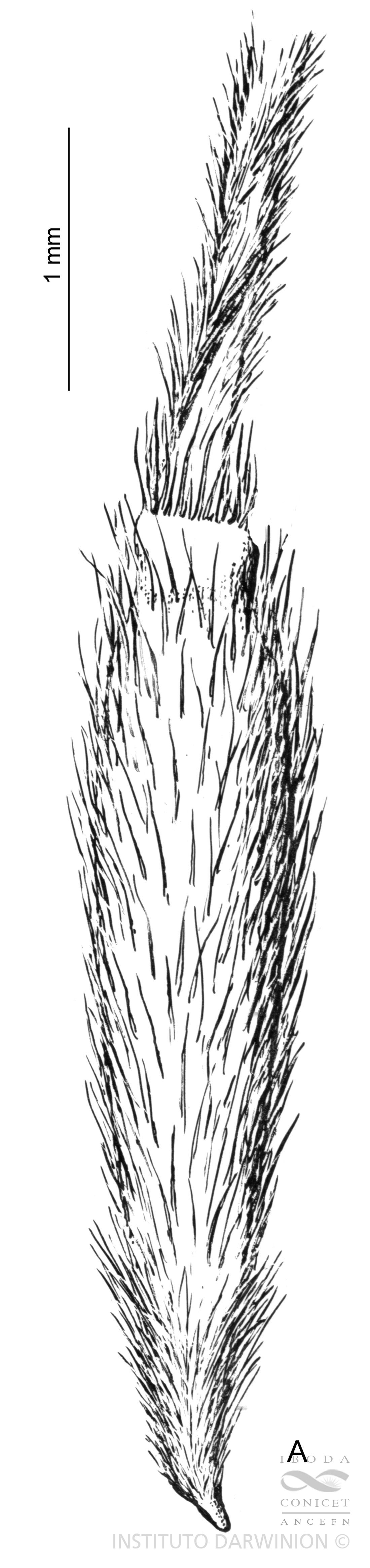 Plantas perennes, de 25-30(-70) cm de alto; cañas cilíndricas, de 0,8-1 mm de diámetro, erguidas o ligeramente decumbentes, simples, paucinodes; nudos castaños, glabros; entrenudos longitudinalmente estriados, glabros; vainas foliares estriadas, glabras a pubérulas, más cortas que los entrenudos, con lóbulos glabros, cuello glabro o con escasos pelos y margenes glabros; lígulas truncadas, ca. 0,2 mm de largo, membranáceas, glabras; láminas foliares lineares, convolutas, de 3-6,5(-12) cm x 1-1,5 mm, ambas caras estriadas, epifilo viloso, hipofilo glabro, margen densamente viloso, más conspicuamente hacia la base de la lámina. Inflorescencia erguida, densa, pauciflora o pluriflora, de 4- 8(-18) cm de largo, parcialmente incluida en la vaina foliar superior, con ramas adpresas; raquis levemente aplanado, hispídulo; ramas y pedicelos angulosos, densamente híspidos. Espiguillas fusiformes, de 5-7 mm de largo; glumas subiguales, de (5-)6-7,5(-10) mm de largo, mayores que el antecio, cortamente atenuadas, membranáceas, violáceas, glabras, 3- nervias; lemma cilíndrica, ligeramente fusiforme, de 3,5-5 x 0,9-1 mm de diámetro, opaca, con ganchos diminutos y densos y pelos ralos, blanquecinos adpresos sobre toda la superficie, excepto en la corona, los superiores no la superan, y pelos densos sobre la mitad proximal del nervio dorsal; corona conspicua, continua con el cuerpo de la lemma, lisa, blanquecina, de 0,3-0,5 mm de alto, con pelos erguidos de 0,2-0,9 mm de largo sobre el borde o cerca de éste; arista 2-geniculada, de 0,9- 1,1(-1,7) cm de largo, híspida, escabriúscula hacia el ápice, robusta, persistente; antopodio subagudo, ca. 0,8 mm de largo, densamente viloso; pálea aguda de 1-1,2 mm de largo, glabra; lodículas 2, oblongas, de 0,8 mm de largo, glabras.