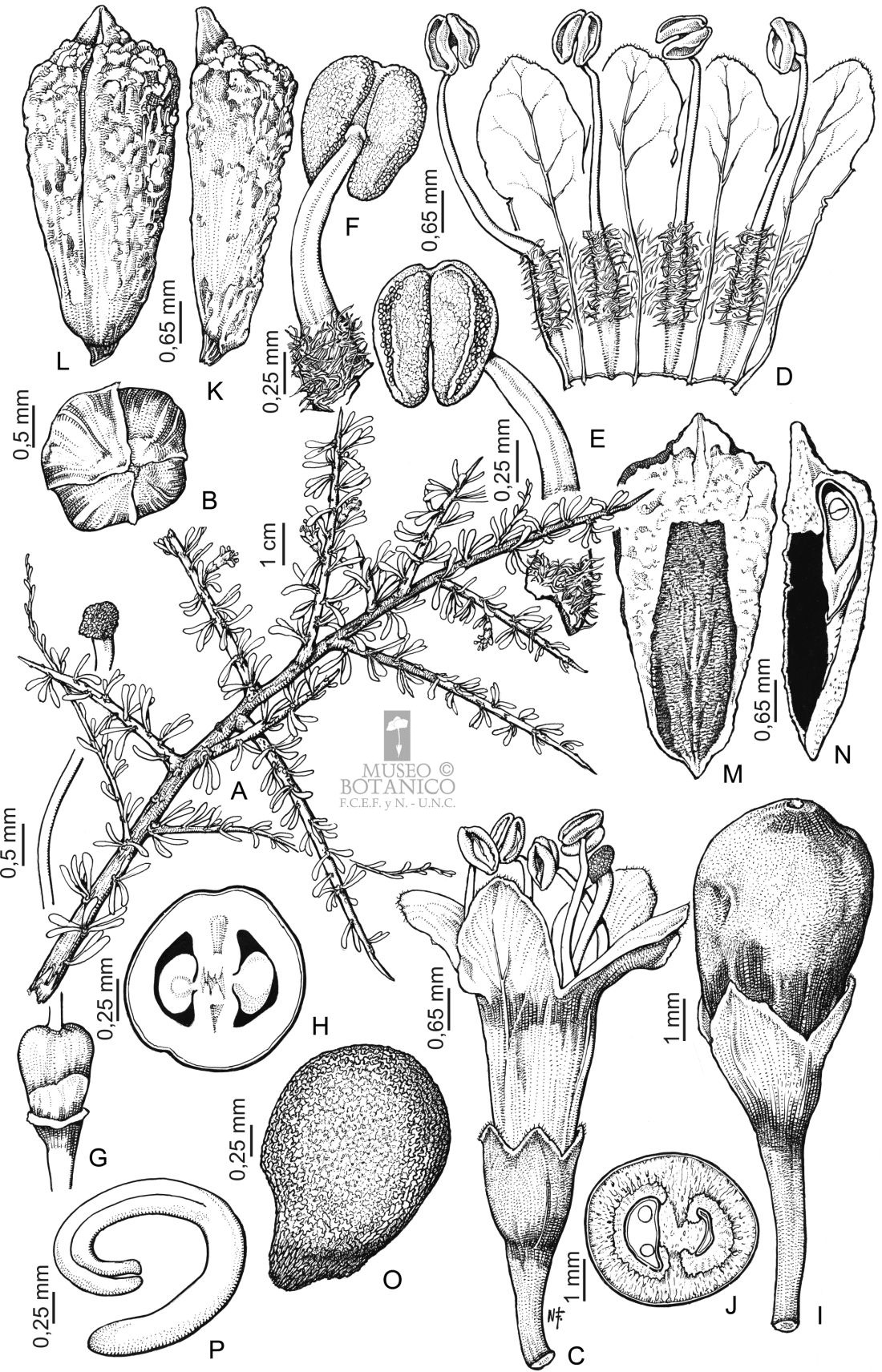 A. Rama florífera. B. Botón floral, vista superior. C. Flor. D. Corola desplegada. E. Estambre, vista ventral. F. Estambre, vista dorsal. G. Gineceo. H. Ovario, corte transversal. I. Fruto. J. Fruto, corte transversal. K. Pireno. L. Pireno, vista dorsal. M. Pireno, vista ventral. N. Pireno, corte longitudinal. O. Semilla. P. Embrión.