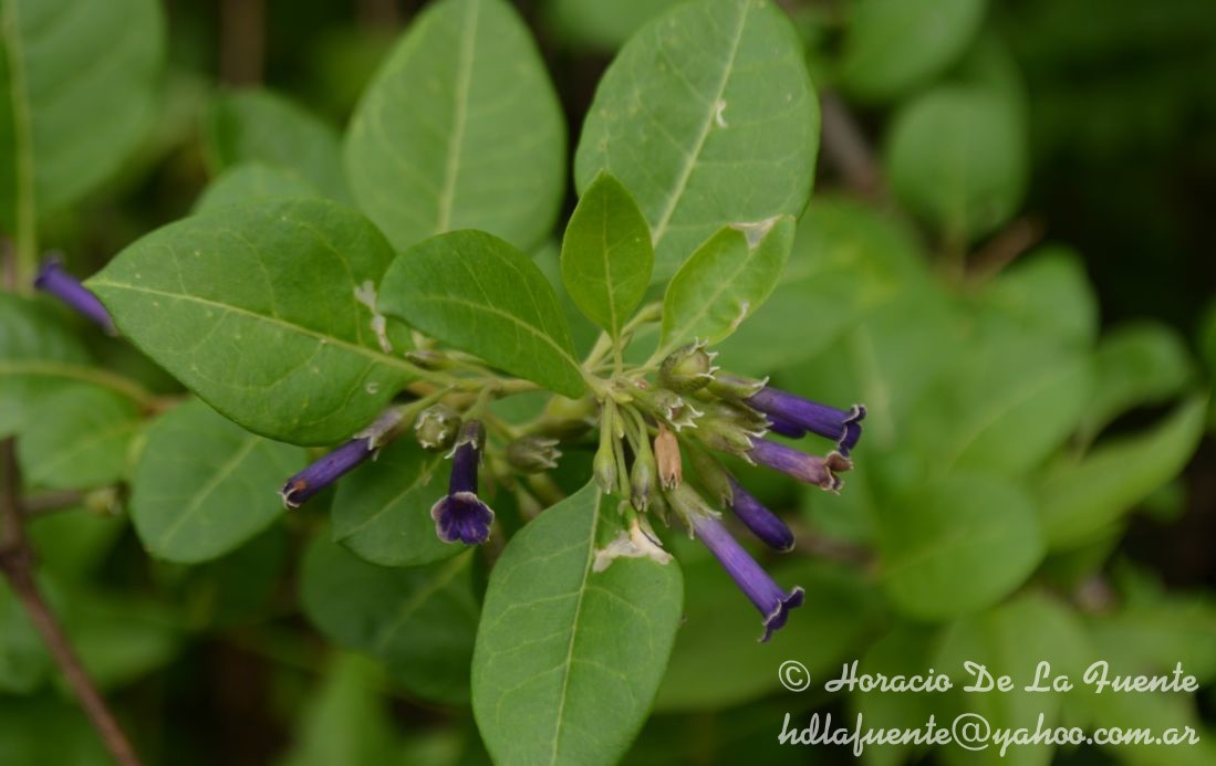 Arbustos de 1-2 m de alto o arbolitos hasta de 5 m; tallos verde amarillentos, grisáceos o castaño-oscuros, pubescentes cuando jóvenes, glabros en la madurez, normalmente con espinas caulinares hasta de 2 cm. Hojas pecioladas; láminas ovadoelípticas, elípticas, ovadas, suborbiculares, de 10-90 × 4,5-47 mm, ápice agudo, acuminado u obtuso, membranáceas, planas, glabras o glabrescentes. Flores 5-meras, raro 4-, 6-, 8-, 9-meras, de 4 a 16 por braquiblasto, raro solitarias; cáliz tubular, con lóbulos más cortos que el tubo, glabro en el exterior pero densamente ciliadolanosos en el borde, al igual que el borde de los lóbulos corolinos, tubo de 2-3,5 mm, lóbulos angostamente triangulares, de 1-2,5 mm; corola violeta intenso y parejo, tubulosa, pilosa en su interior en la zona de inserción de los estambres, tubo de 10,5-17,5(- 21,5) × 2-3,5 mm, lóbulos de 1-2,5 × ca. 2 mm; estambres adheridos al tubo corolino en su hemialtura, o poco más abajo, filamentos desiguales en longitud, por lo común 2 largos que alcanzan el nacimiento de los lóbulos, 2 intermedios y uno más corto, todos incluidos, pubescentes en su base; ovario con nectario inconspicuo en su base, estilo incluso. Baya globosa a ovoide, roja, anaranjada o atropurpúrea, con dos pequeñas concreciones esclerosas apicales microscópicas; semillas irregulares, poliédricas o reniformes, de 1-3, 5 × ca. 2 mm, con pliegues laterales, episperma con celdillas de paredes onduladas, apenas marcadas.