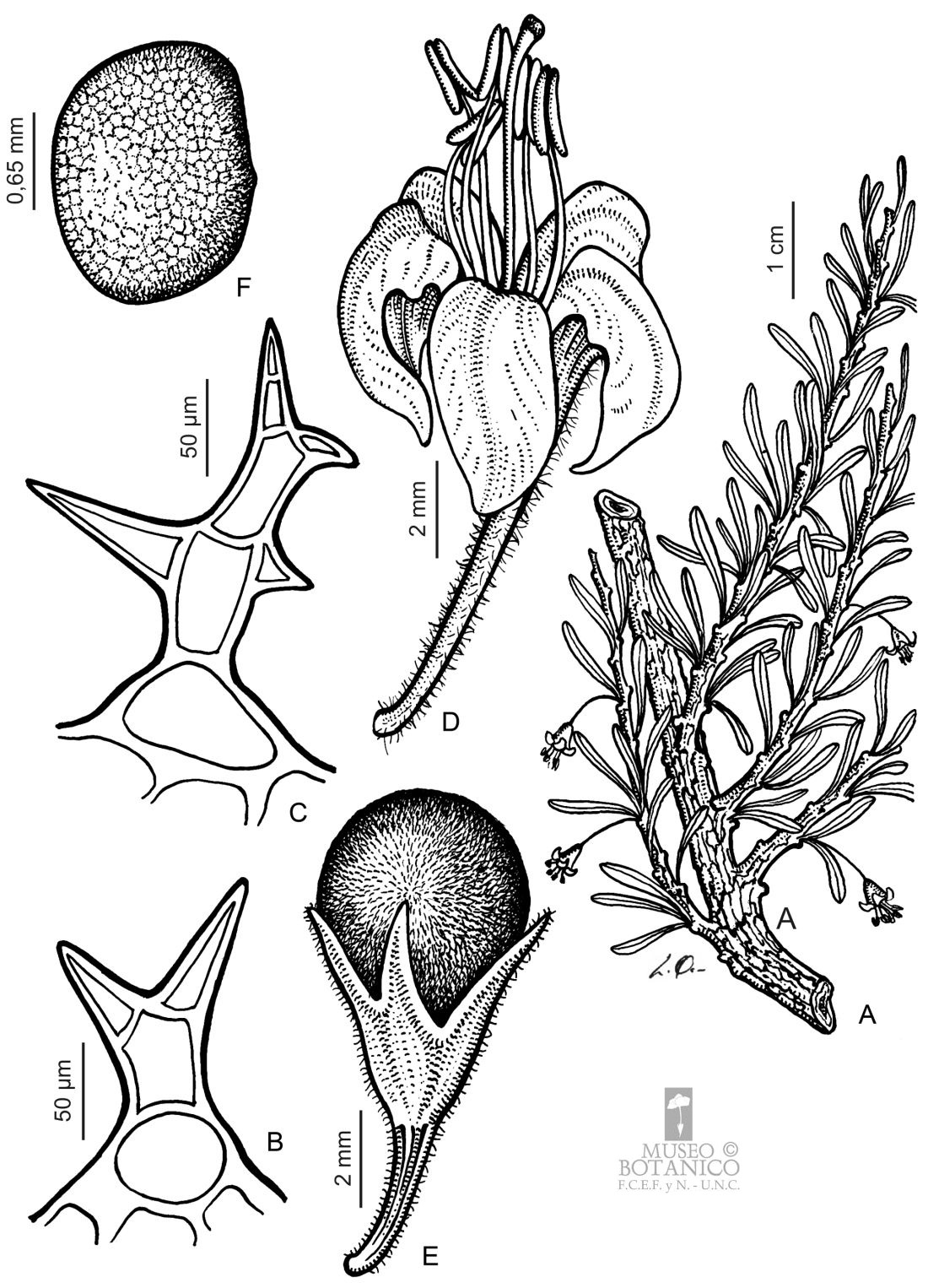 A. Rama florífera. B. Tricoma bifurcado de hoja. C. Tricoma ramificado de hoja. D. Flor. E. Fruto. F. Semilla.