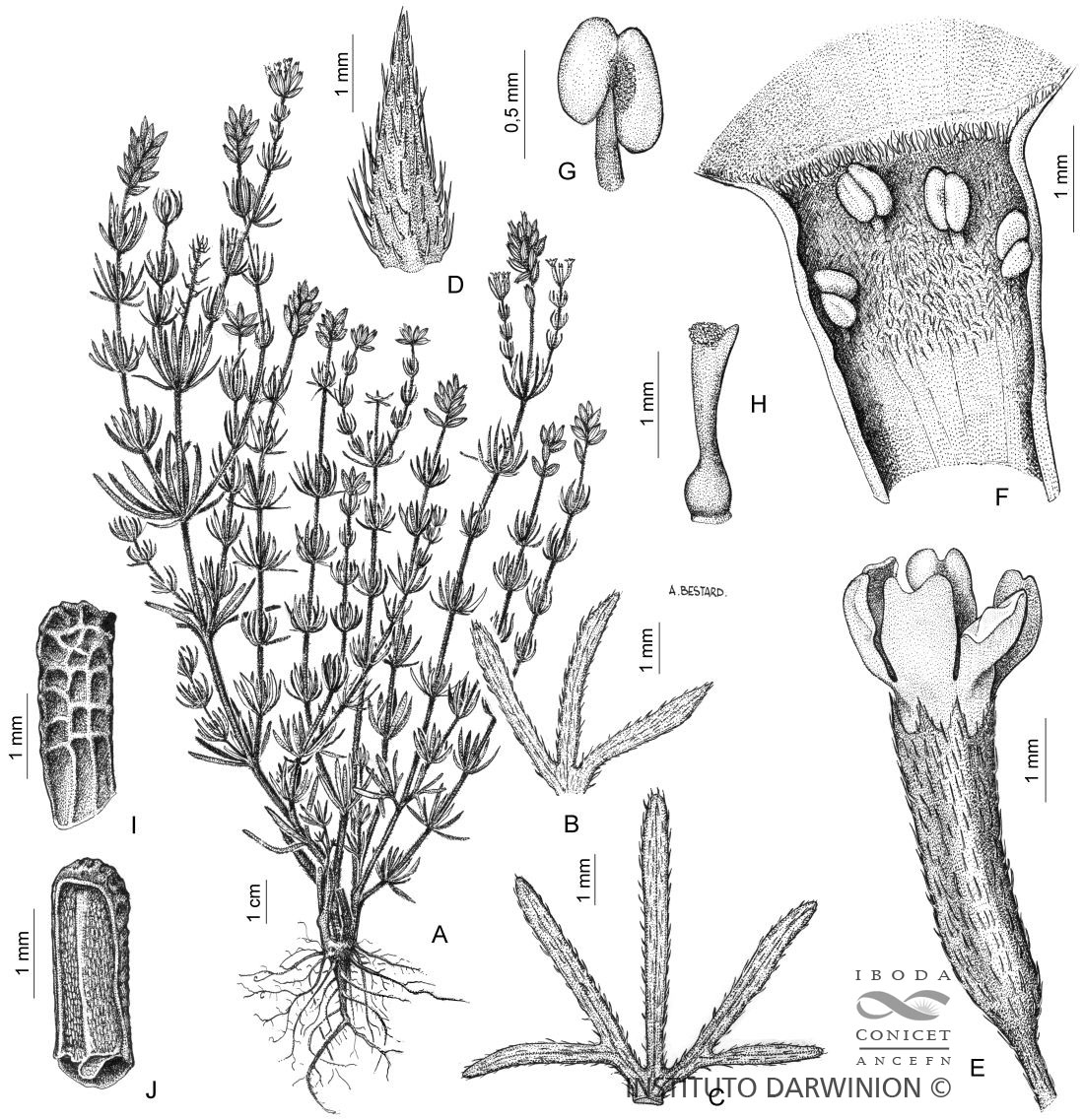 A. Planta. B-C. Hojas. D. Bráctea, cara externa. E. Flor. F. Corola extendida, vista interna con androceo, detalle. G. Antera superior, vista dorsal. H. Gineceo. I-J. Clusa, caras externa e interna respectivamente.