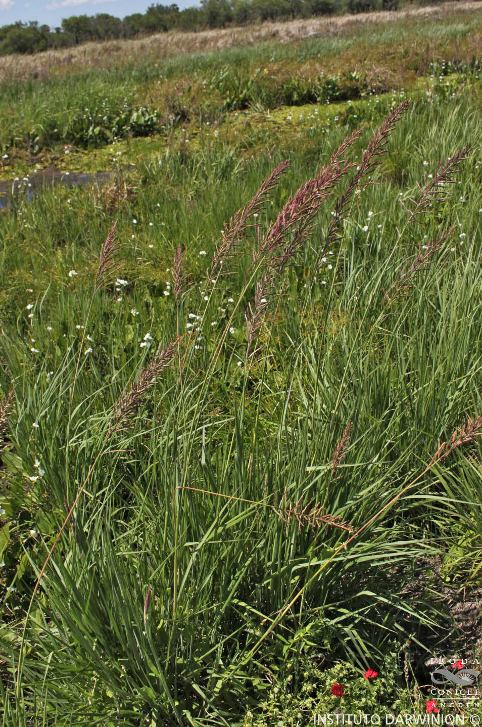 Plantas perennes, densamente cespitosas, robustas; cañas floríferas de 1,5-2,5 m x 8-15 mm, erguidas, simples; entrenudos de 20-30 cm de largo, cilíndricos, huecos, glabros, pajizos; nudos castaños, glabros; vainas de 15-45 cm de largo, mayores que los entrenudos, glabras a papiloso-pilosas junto a la unión con la lámina, de dorso redondeado a aquilladas en la porción superior, con los márgenes membranáceos, glabros a largamente pestañosos; vainas basales flojas, ligeramente aquilladas en la porción superior, lustrosas, esponjosas, reticuladas; lígulas membranáceas, de 2-3,6 mm de largo, truncadas, ocreáceas; pseudolígula formada por un denso arco de pelos rígidos, blanco-amarillentos, hasta de 9 mm de largo; cuello con una marca triangular castaña, glabro a hirsuto; láminas lineares, de 35-80 x 1-2 cm, rígidas, ascendentes, planas en la porción media y superior, angostadas y plegadas hacia la base, continuándose con la vaina, cara adaxial cortamente híspida, la abaxial glabra, el ápice agudo, los márgenes cortantes. Inflorescencias piramidales, densifloras, de 18-40 x 6-23 cm, exertas, terminales; pedúnculos largamente exertos, hasta de 80 cm de largo, cilíndricos, glabros; eje principal anguloso, de 18-37 cm de largo, esparcida a densamente papiloso-piloso; pulvínulos largamente pilosos, con pelos blanquecinos de 3-5 mm de largo; racimos 25-100, ascendentes divergentes, alternos, subopuestos a subverticilados, terminando en una espiguilla desarrollada, los inferiores de 8-17 cm de largo, los superiores de 1-3 cm de largo; raquis de los racimos de 1-1,6 mm de ancho, aplanado, verde a violáceo, glabro, los márgenes escabrosos, densa a esparcidamente papiloso-pilosos, con pelos blanquecinos de 3,5-6 mm de largo; pedicelos hasta de 2 mm de largo, aplanados, escabriúsculos; espiguillas en pares o en grupos de 3-6 espiguillas, imbricadas, densamente dispuestas en el raquis. Espiguillas anchamente elipsoides, de (2,4-)2,6-3,2 x (1,3-)1,5-2 mm, plano-convexas, abruptamente acuminadas, ferrugíneas o con tintes violáceos, pubescentes; gluma superior y lemma inferior subiguales, agudas, tan largas como la espiguilla, hialinas; gluma inferior ausente; gluma superior con el dorso esparcidamente pubescente, más densamente a lo largo de los márgenes apicales, en ocasiones sólo sobre los márgenes, con pelos de 0,2-0,4 mm de largo, delicados, blanquecinos, 3(-5)-nervia, con un nervio central, los restantes submarginales; lemma inferior glumiforme, glabra a o con pelitos aislados, más densamente hacia los márgenes, 3(-5)-nervia; pálea y flor inferior ausentes; antecio superior elipsoide, de 2,2-3 x 1,4-1,6 mm, crustáceo, papiloso, pajizo, glabro; lemma 5-nervia; lodículas 2, ca. 0,4 mm de largo, truncadas, conduplicadas; estambres 3, anteras de 1,2-1,6 mm de largo; cariopsis no vista.