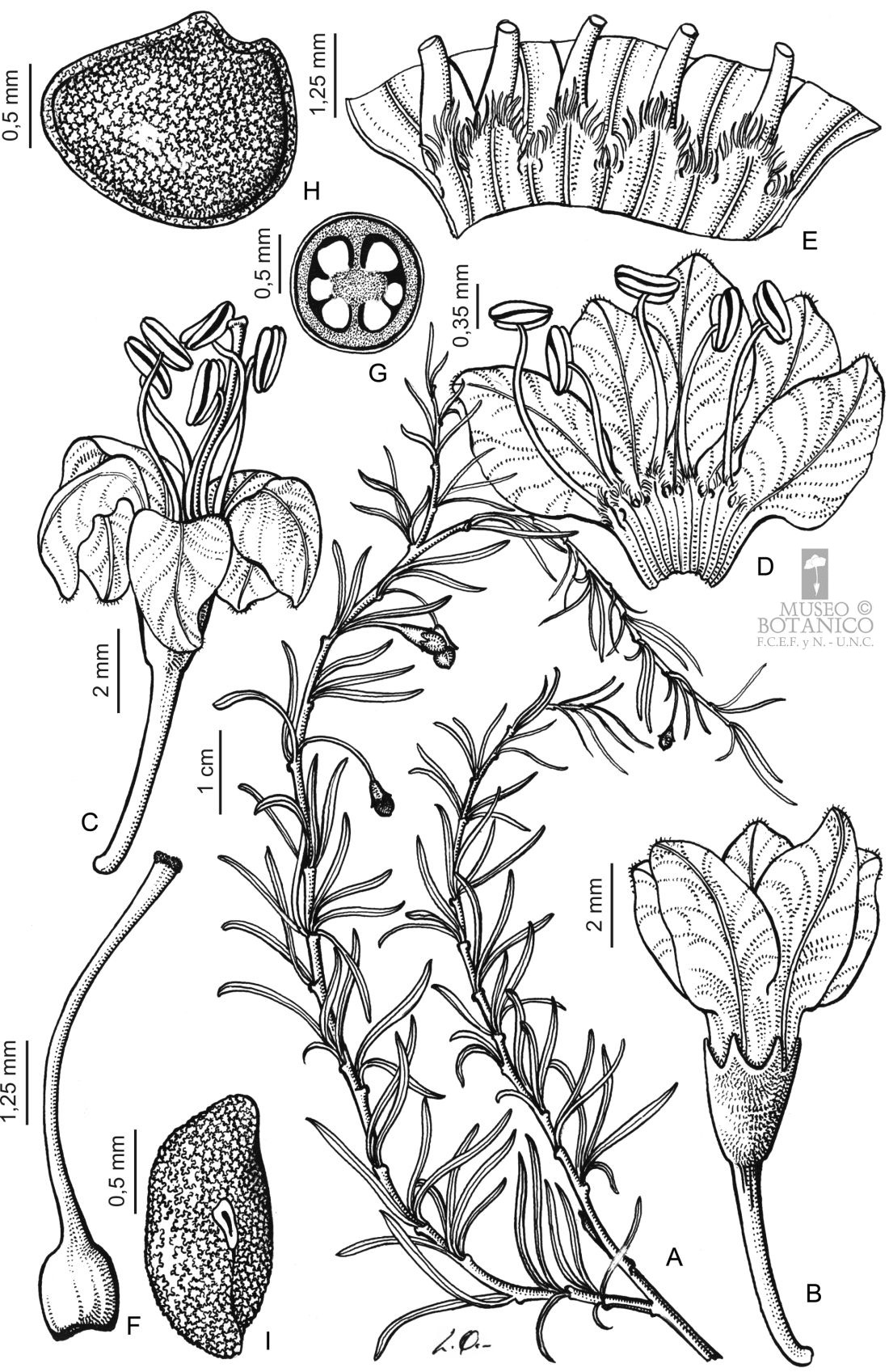 A. Rama fructífera. B. Flor con los lóbulos corolinos intencionalmente levantados. C. Flor. D. Corola desplegada. E. Sector basal del interior de la corola desplegada. F. Gineceo. G. Ovario, corte transversal. H. Semilla. I. Semilla, vista hilar.