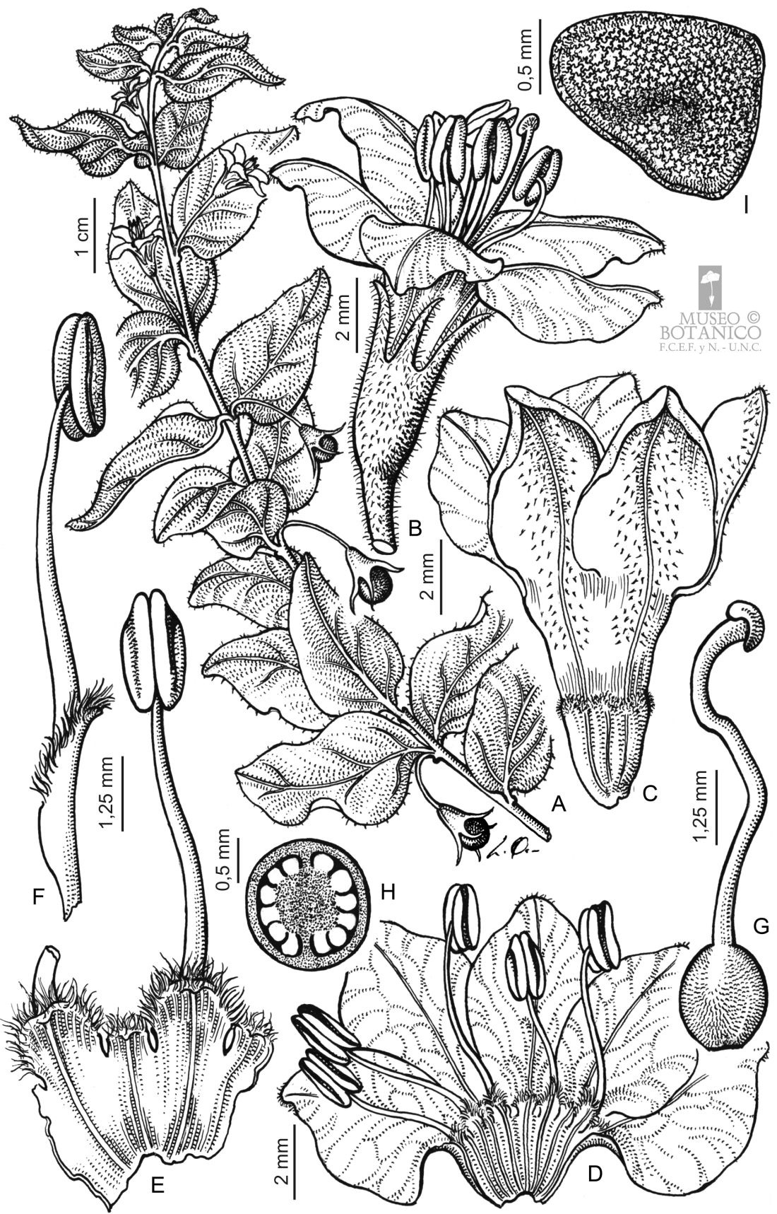 A. Rama fructífera. B. Flor. C. Corola con lóbulos levantados artificialmente. D. Corola desplegada. E. Sector basal del interior de la corola con un estambre. F. Estambre, vista lateral. G. Gineceo. H. Ovario, corte transversal. I. Semilla.