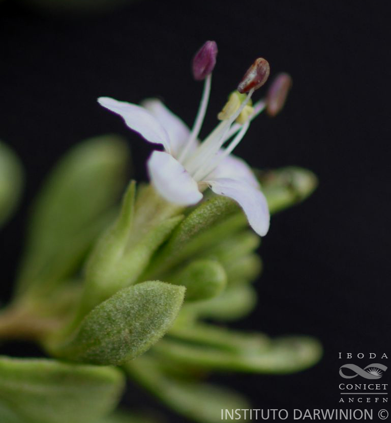Arbustos de 0,7-2,5 m de alto; tallos castaño-oscuros o grisáceos, pubescentes cuando jóvenes, luego glabros, con braquiblastos marcados, ramificados, con ramas espiniformes por lo general perpendiculares a la rama que las soporta. Hojas planas; láminas filiformes, linear-obovadas o lineares, de 2,5- 30(-40) × 0,5-3(-5) mm, atenuadas en la base, generalmente obtusas en el ápice, membranáceas, glabras, glabrescentes o pubescentes, con tricomas simples y glandulares. Flores 5-meras, raro 6-meras, solitarias, con frecuencia arqueadas; cáliz tubuloso 5-6-dentado, con dientes irregulares, más largos, iguales o más cortos que el tubo, glabro a pubescente con pelos simples y glandulares, tubo de 1,8-3 mm, lóbulos angostamente subtriangulares, de 1-3 mm, agudos o acuminados; corola violácea o lilacina, con la parte interna del tubo más oscura y nervaduras atropurpúreas en los lóbulos y en el tubo, glabra externamente, más raro pubescente, pilosa en su interior formando un anillo en la zona de inserción de los estambres y por debajo de ella, más densamente en los hacecillos estaminales, tubulosa, ensanchándose en forma suave hacia el ápice y un poco contraída por encima del ovario, tubo de 8-10(-12,5) × 2-3 mm, lóbulos subtriangulares de 2-3 × 1,5-2,3 mm; estambres adheridos al tubo corolino a distinto nivel, más arriba de su hemialtura, filamentos desiguales, generalmente 2 más largos que llegan hasta el nacimiento de los lóbulos y son apenas exertos y los 3 restantes más cortos e incluidos, con pelos esparcidos en su base; ovario con nectario verde e inconspicuo, estilo exerto. Baya ovoide, roja, atropurpúrea o anaranjada, de 4-6 × 3-4 mm; semillas reniformes, 8 a 15 por lóculo; episperma con celdillas de paredes onduladas, muy marcadas. Lycium