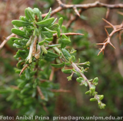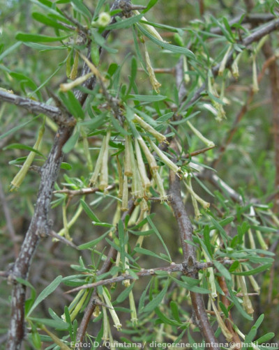 Arbustos de 0,8-2,5 m de alto; tallos grisáceos o castañooscuros, glabros, con abundantes ramas espiniformes, tortuosas, péndulas. Hojas brevemente pecioladas, planas; láminas linear-obovadas o linear-espatuladas, de (1-)3-25 × 0,8-3,5(-5) mm, atenuadas en la base, membranáceas, glabras o raramente con algunos pelos glandulares o simples esparcidos. Flores 4- meras, solitarias, por excepción 2 ó 3 por braquiblasto, normalmente péndulas; cáliz acopado, regularmente 4-dentado, glabro por excepción con algunos pelos glandulares o simples, tubo de 0,7-1,3 mm, lóbulos subtriangulares de 0,4-1 mm; corola amarillo- verdosa, tubulosa, glabra en su exterior, raro pubescente, pilosa por dentro de la zona de inserción de los estambres y aún más abajo, tubo de 10-15,5(-17) × 2-3,5 mm, lóbulos redondeados, revolutos, de 1-2 × 1-2 mm; estambres adheridos al tubo corolino en su hemialtura o más arriba, todos al mismo nivel, a veces algunos a distinto nivel, filamentos subiguales, pilosos en su base, poco exertos; ovario con nectario basal rojo-anaranjado, prominente, estilo incluso, poco o muy exerto. Baya ovoide, alargada, roja o atropurpúrea, de 5-10 × ca. 7 mm, con dos concreciones apicales microscópicas; semillas reniformes; episperma con celdillas de paredes onduladas, más o menos marcadas.