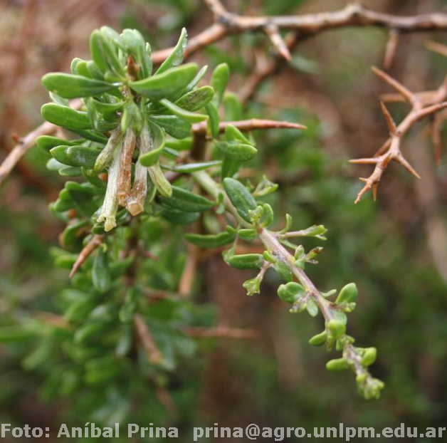 Arbustos de 0,8-2,5 m de alto; tallos grisáceos o castañooscuros, glabros, con abundantes ramas espiniformes, tortuosas, péndulas. Hojas brevemente pecioladas, planas; láminas linear-obovadas o linear-espatuladas, de (1-)3-25 × 0,8-3,5(-5) mm, atenuadas en la base, membranáceas, glabras o raramente con algunos pelos glandulares o simples esparcidos. Flores 4- meras, solitarias, por excepción 2 ó 3 por braquiblasto, normalmente péndulas; cáliz acopado, regularmente 4-dentado, glabro por excepción con algunos pelos glandulares o simples, tubo de 0,7-1,3 mm, lóbulos subtriangulares de 0,4-1 mm; corola amarillo- verdosa, tubulosa, glabra en su exterior, raro pubescente, pilosa por dentro de la zona de inserción de los estambres y aún más abajo, tubo de 10-15,5(-17) × 2-3,5 mm, lóbulos redondeados, revolutos, de 1-2 × 1-2 mm; estambres adheridos al tubo corolino en su hemialtura o más arriba, todos al mismo nivel, a veces algunos a distinto nivel, filamentos subiguales, pilosos en su base, poco exertos; ovario con nectario basal rojo-anaranjado, prominente, estilo incluso, poco o muy exerto. Baya ovoide, alargada, roja o atropurpúrea, de 5-10 × ca. 7 mm, con dos concreciones apicales microscópicas; semillas reniformes; episperma con celdillas de paredes onduladas, más o menos marcadas.