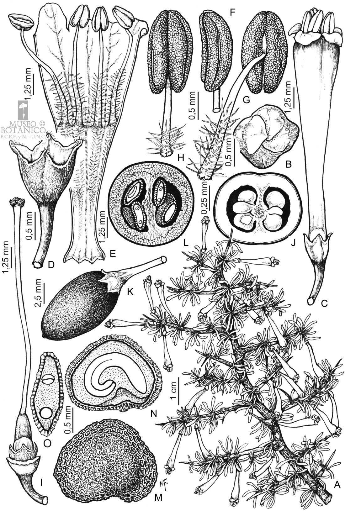Arbustos de 0,8-2,5 m de alto; tallos grisáceos o castañooscuros, glabros, con abundantes ramas espiniformes, tortuosas, péndulas. Hojas brevemente pecioladas, planas; láminas linear-obovadas o linear-espatuladas, de (1-)3-25 × 0,8-3,5(-5) mm, atenuadas en la base, membranáceas, glabras o raramente con algunos pelos glandulares o simples esparcidos. Flores 4- meras, solitarias, por excepción 2 ó 3 por braquiblasto, normalmente péndulas; cáliz acopado, regularmente 4-dentado, glabro por excepción con algunos pelos glandulares o simples, tubo de 0,7-1,3 mm, lóbulos subtriangulares de 0,4-1 mm; corola amarillo- verdosa, tubulosa, glabra en su exterior, raro pubescente, pilosa por dentro de la zona de inserción de los estambres y aún más abajo, tubo de 10-15,5(-17) × 2-3,5 mm, lóbulos redondeados, revolutos, de 1-2 × 1-2 mm; estambres adheridos al tubo corolino en su hemialtura o más arriba, todos al mismo nivel, a veces algunos a distinto nivel, filamentos subiguales, pilosos en su base, poco exertos; ovario con nectario basal rojo-anaranjado, prominente, estilo incluso, poco o muy exerto. Baya ovoide, alargada, roja o atropurpúrea, de 5-10 × ca. 7 mm, con dos concreciones apicales microscópicas; semillas reniformes; episperma con celdillas de paredes onduladas, más o menos marcadas.