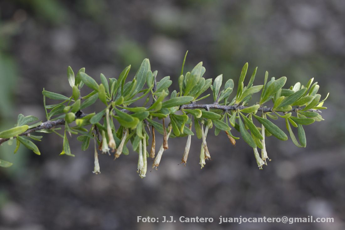 Arbustos de 0,8-2,5 m de alto; tallos grisáceos o castañooscuros, glabros, con abundantes ramas espiniformes, tortuosas, péndulas. Hojas brevemente pecioladas, planas; láminas linear-obovadas o linear-espatuladas, de (1-)3-25 × 0,8-3,5(-5) mm, atenuadas en la base, membranáceas, glabras o raramente con algunos pelos glandulares o simples esparcidos. Flores 4- meras, solitarias, por excepción 2 ó 3 por braquiblasto, normalmente péndulas; cáliz acopado, regularmente 4-dentado, glabro por excepción con algunos pelos glandulares o simples, tubo de 0,7-1,3 mm, lóbulos subtriangulares de 0,4-1 mm; corola amarillo- verdosa, tubulosa, glabra en su exterior, raro pubescente, pilosa por dentro de la zona de inserción de los estambres y aún más abajo, tubo de 10-15,5(-17) × 2-3,5 mm, lóbulos redondeados, revolutos, de 1-2 × 1-2 mm; estambres adheridos al tubo corolino en su hemialtura o más arriba, todos al mismo nivel, a veces algunos a distinto nivel, filamentos subiguales, pilosos en su base, poco exertos; ovario con nectario basal rojo-anaranjado, prominente, estilo incluso, poco o muy exerto. Baya ovoide, alargada, roja o atropurpúrea, de 5-10 × ca. 7 mm, con dos concreciones apicales microscópicas; semillas reniformes; episperma con celdillas de paredes onduladas, más o menos marcadas.