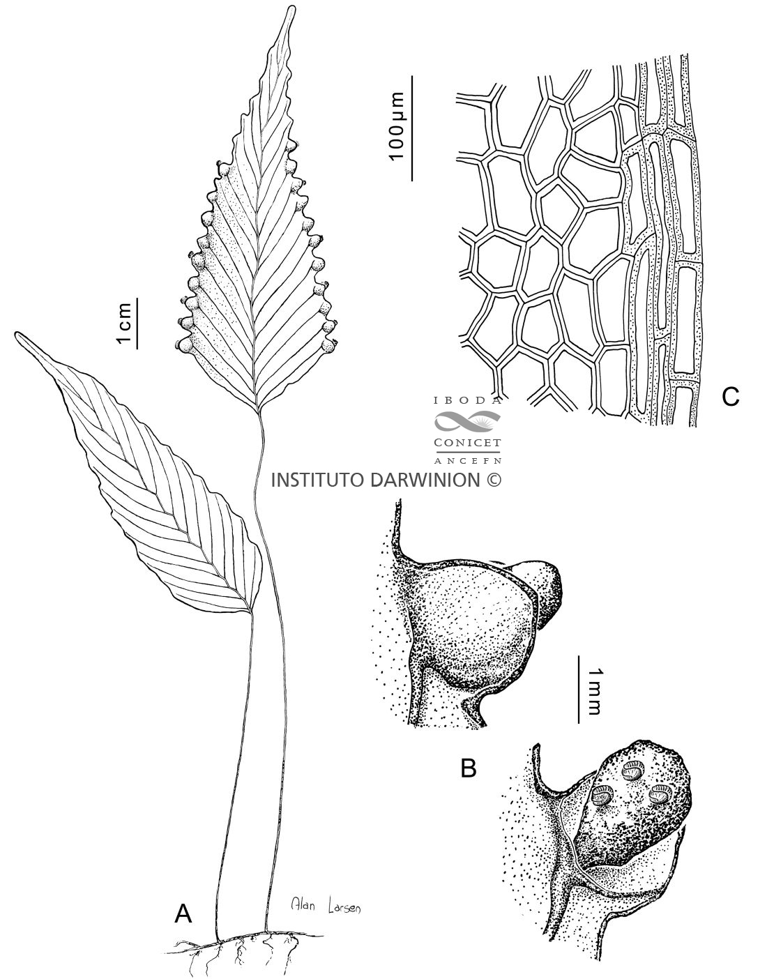A. Planta. B. Detalles de un indúsio y de un receptáculo. C. Detalle al microscopio del margen de la fronde.