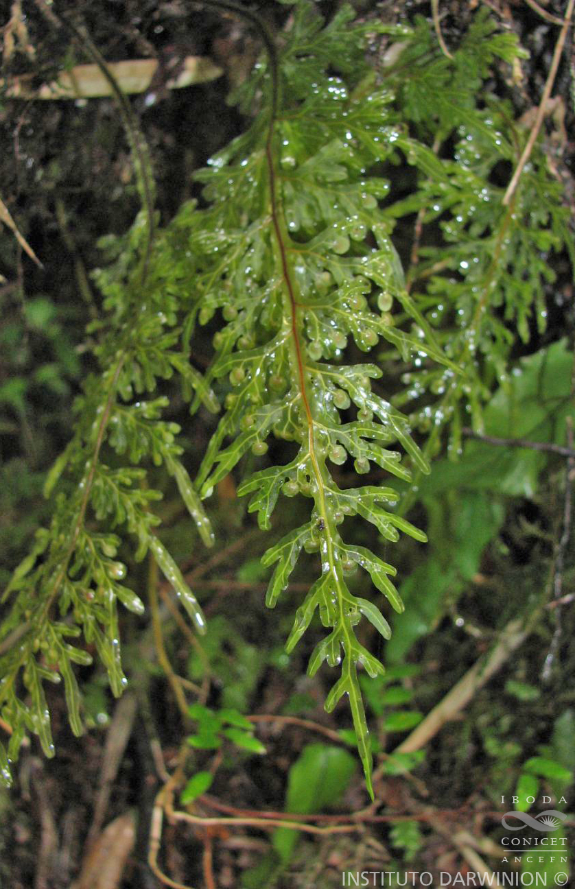 Rizomas filiformes, ramificados, de color pardo claro hasta gris oscuro, de 0,2-0,8 mm de diámetro; pelos del rizoma castaños, simples, pluricelulares, de 0,2-1,1 mm de largo, escasos, caedizos a la madurez. Frondes remotas, de (14-)19-31 cm de largo; pecíolos castaños, teretes, de 0,2-0,9 mm de diámetro, de (5-)9-12 cm de largo, con alas desde la base, caedizas, delgadas, o desde la parte media, ensanchándose hacia el extremo hasta de 0,35 mm de ancho, de margen entero, en frondes jóvenes con escasos pelos en la base; láminas lanceoladas u ovado-lanceoladas, 3-pinnatífidas, de 10- 20 × 3-10 cm, membranáceas, glabras; pinnas ovado-lanceoladas, 2-pinnatífidas, de 1-6 × 0,6-2 cm, simétricas; nervaduras pardo claras hasta amarillo verdosas, en general con la primer pinnula acroscópica flabelada, o de otra forma, pero con divisiones dicotómicas cercanas que generan 2 o 3 segmentos fértiles; raquis y costas notablemente más gruesos que las divisiones que generan, predominando un crecimiento simpodial con el segmento apical más desarrollado, en forma de caudícula y hasta de 3 cm de largo; segmentos lineares u oblongos, de (0,8-)1,2-2,2 mm de ancho, de ápice redondeado o emarginado, de margen entero, en ocasiones algo ondulado; raquis castaño oscuros, hasta pardos o amarillo verdosos, verdes en vivo, glabros o raramente con escasos pelos multicelulares, teretse, con alas de 0,7-1,1 mm de ancho, de margen entero, plano o levemente ondulado. Soros generalmente en todas las pinnas, más frecuentes sobre las pinnas medias y apicales, sobre segmentos cortos, más angostos que el indusio, a menudo subaxilares luego de una división de la costa, o en otra posición a ambos lados de las pinnas; involucros orbiculares a reniformes, no inmersos en la lámina, base plana, ápice redondo, en ocasiones emarginado, margen entero, abiertos hasta la base; receptáculos orbiculares a subflabelados, aplanados, insertos.
