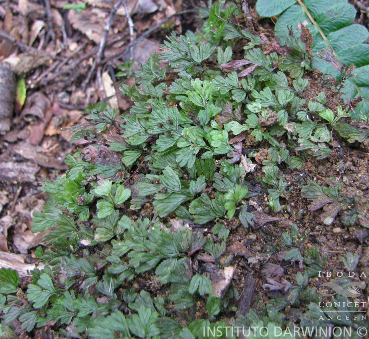 Rizomas filiformes, divididos, castaño-oscuros, de 0,3-0,4 mm de diámetro, con tricomas rojizos de 0,25-0,65 mm de largo; raíces delicadas. Frondes distantes, separadas ca. 1 cm, de 1,7-8,5 cm de largo; pecíolos castaño-oscuros, de 0,6-3,5 cm de largo, no alado, con pelos simples dispersos; láminas ovadas a lineares, pinnado-pinnatifidas a 2-3-pinnatifidas, ocasionalmente con pelos rojizos sobre las venas y en la base del indusio; ráquis castaño-oscuro, rectos o en zig-zag, alado, más ancho en el ápice, o sólo alados en el ápice, piloso o no; pinnas ovadas, elípticas o rómbicas, 2-pinnatifidas, de 0,5-1,2 x 0,3-0,8 cm, divididas en ambos lados, al menos las basales, imbricadas o algo distantes; últimos segmentos lineares a oblongos, de 1-1,2 mm de ancho, márgenes con dientes pluricelulares y ápice redondeado o truncado; soros 1 por pinna, subaxilares, o sobre un segmento acroscópico, corto y alado, alejado del plano perpedicular de la lámina cuando maduro; insudio redondeado a rómbic, con base aguda, ligeramente inmersa en el segmento, ápice redondeado, las valvas se abren hasta la mitad o algo más cuando maduros, con márgenes enteros o denticulados o márgenes erosos, ocasionalmente con pelos rojizos en la base, receptáculo cilíndrico, inserto, más corto que el indusio.
