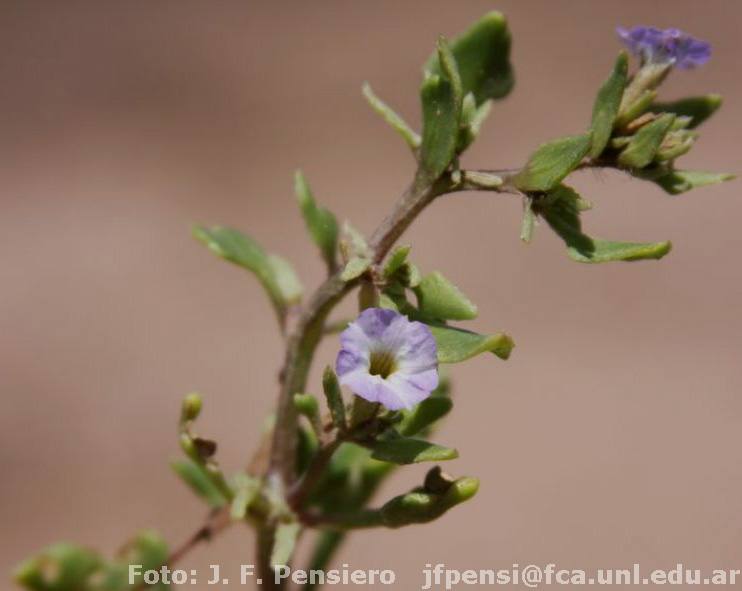 Hierbas anuales, decumbentes, glabrescentes; tallos ca. 60 cm de largo; órganos vegetativos con rafidios. Pecíolos de 5-15 mm; láminas ovado-deltoides, de 15-30 × 10-20 mm. Flores sésiles, 2 por nudo; cáliz de 6-6,5 mm, lóbulos foliáceos, 3 muy breves (uno hasta de 1,5 mm) y los 2 más largos desiguales (uno ca. 6 mm y el otro 4 mm); corola ca. 15 mm, blanquecina, celeste, lilacina o violácea, limbo amplio ca. 10 mm de diámetro; par inferior de estambres de 4 mm, el par superior de 3 mm y el impar de 2 mm, filamentos con gran cantidad de tricomas eglandulares y ramificados, anteras de 0,75 × 0,5 mm; gineceo ca. 7 mm. Fruto de 4 × 2 mm, concrescente con la axila; cáliz fructífero 5-nervado, lóbulos foliáceos; semillas de 3 × 1 mm, embrión recto o levemente curvo.