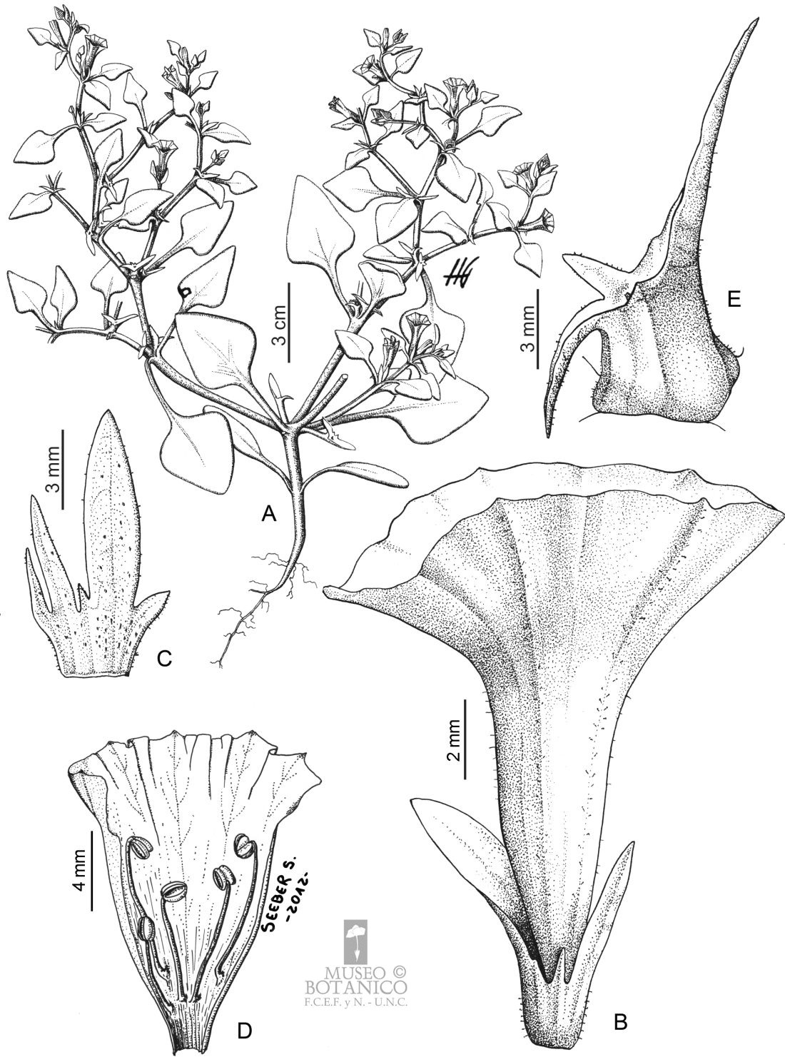 Hierbas anuales, decumbentes, glabrescentes; tallos ca. 60 cm de largo; órganos vegetativos con rafidios. Pecíolos de 5-15 mm; láminas ovado-deltoides, de 15-30 × 10-20 mm. Flores sésiles, 2 por nudo; cáliz de 6-6,5 mm, lóbulos foliáceos, 3 muy breves (uno hasta de 1,5 mm) y los 2 más largos desiguales (uno ca. 6 mm y el otro 4 mm); corola ca. 15 mm, blanquecina, celeste, lilacina o violácea, limbo amplio ca. 10 mm de diámetro; par inferior de estambres de 4 mm, el par superior de 3 mm y el impar de 2 mm, filamentos con gran cantidad de tricomas eglandulares y ramificados, anteras de 0,75 × 0,5 mm; gineceo ca. 7 mm. Fruto de 4 × 2 mm, concrescente con la axila; cáliz fructífero 5-nervado, lóbulos foliáceos; semillas de 3 × 1 mm, embrión recto o levemente curvo.