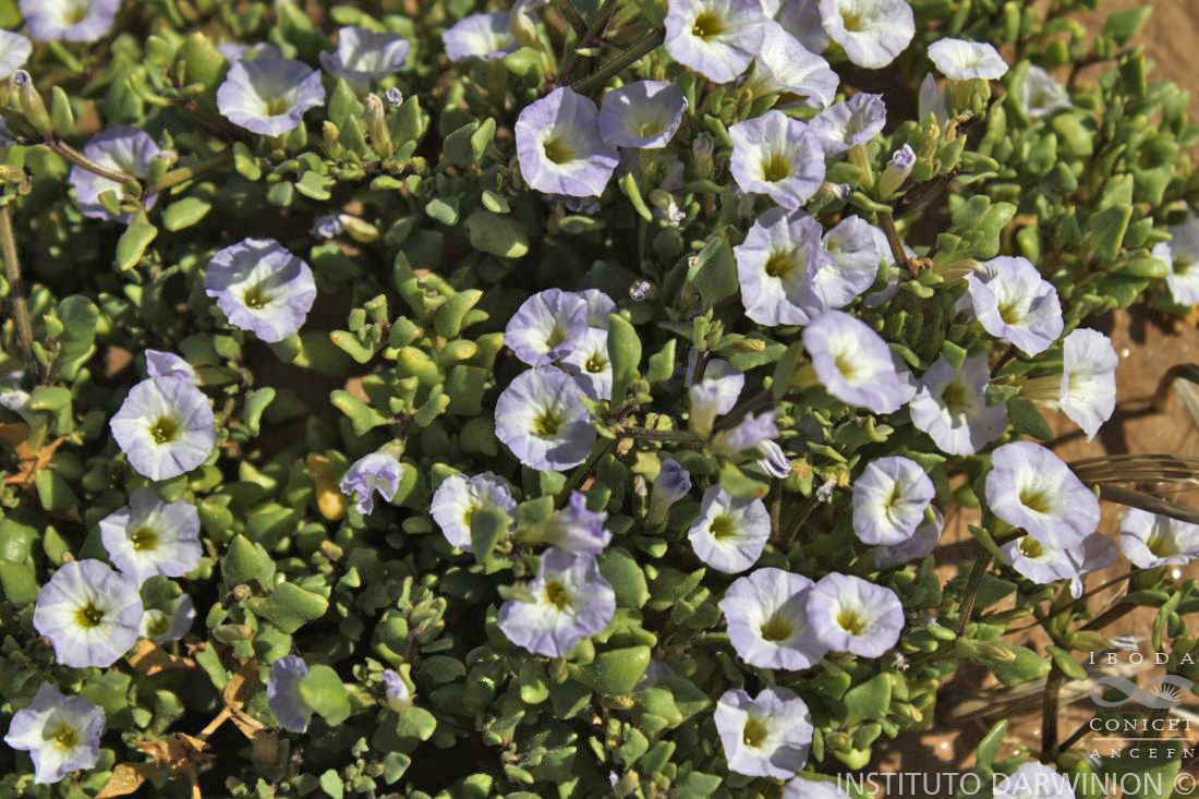 Hierbas anuales, decumbentes, glabrescentes; tallos ca. 60 cm de largo; órganos vegetativos con rafidios. Pecíolos de 5-15 mm; láminas ovado-deltoides, de 15-30 × 10-20 mm. Flores sésiles, 2 por nudo; cáliz de 6-6,5 mm, lóbulos foliáceos, 3 muy breves (uno hasta de 1,5 mm) y los 2 más largos desiguales (uno ca. 6 mm y el otro 4 mm); corola ca. 15 mm, blanquecina, celeste, lilacina o violácea, limbo amplio ca. 10 mm de diámetro; par inferior de estambres de 4 mm, el par superior de 3 mm y el impar de 2 mm, filamentos con gran cantidad de tricomas eglandulares y ramificados, anteras de 0,75 × 0,5 mm; gineceo ca. 7 mm. Fruto de 4 × 2 mm, concrescente con la axila; cáliz fructífero 5-nervado, lóbulos foliáceos; semillas de 3 × 1 mm, embrión recto o levemente curvo.