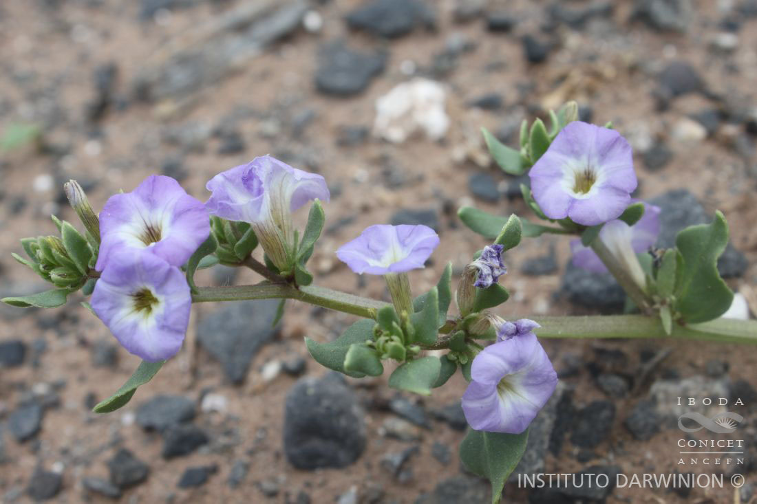 Hierbas anuales, decumbentes, glabrescentes; tallos ca. 60 cm de largo; órganos vegetativos con rafidios. Pecíolos de 5-15 mm; láminas ovado-deltoides, de 15-30 × 10-20 mm. Flores sésiles, 2 por nudo; cáliz de 6-6,5 mm, lóbulos foliáceos, 3 muy breves (uno hasta de 1,5 mm) y los 2 más largos desiguales (uno ca. 6 mm y el otro 4 mm); corola ca. 15 mm, blanquecina, celeste, lilacina o violácea, limbo amplio ca. 10 mm de diámetro; par inferior de estambres de 4 mm, el par superior de 3 mm y el impar de 2 mm, filamentos con gran cantidad de tricomas eglandulares y ramificados, anteras de 0,75 × 0,5 mm; gineceo ca. 7 mm. Fruto de 4 × 2 mm, concrescente con la axila; cáliz fructífero 5-nervado, lóbulos foliáceos; semillas de 3 × 1 mm, embrión recto o levemente curvo.