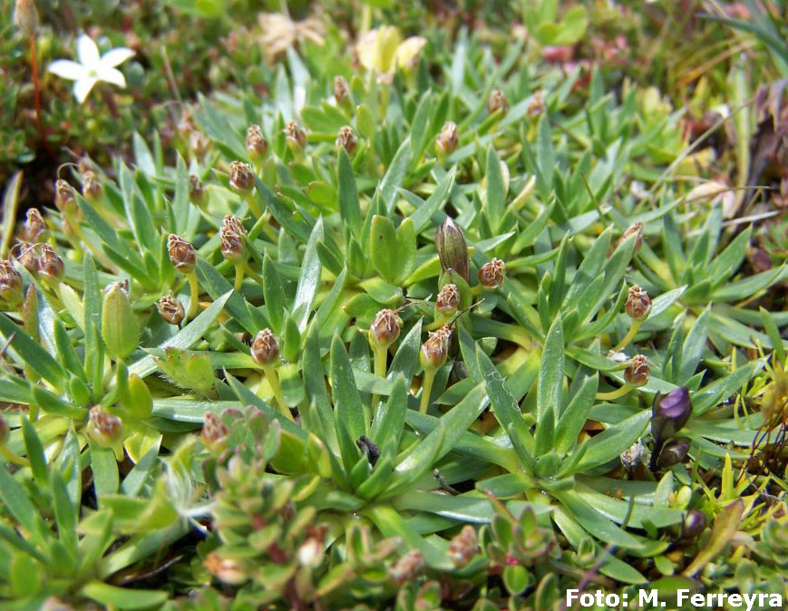Hierbas perennes, formando grandes cojines o montículos hasta de 0,1 m de alto; raíz primaria de 0,2-1 cm de diámetro, prominente. Hojas arrosetadas, alternas; láminas lineares a linear-lanceoladas, de 1-29 × 0,01-0,02 cm, ápice acuminado o cuspidado, base atenuada formando un pseudopecíolo, margen entero, pubescencia tenue de pelos antrorsos o bien glabrescentes en ambas caras. Flores solitarias, raramente 2, dispuestas en el ápice de un escapo erecto, de 0,3-5 cm de largo, terete, glabrescente a piloso con tricomas generalmente adpresos; brácteas 2, de 1,7-3,8 mm de largo, ovadas, acuminadas; cáliz con sépalos connados sólo en la base, elípticos, de 3-4 mm de largo, acuminados, nervio medio glabro; corola con el tubo glabro, lóbulos ovados, de 1-2 mm de largo, margen involuto; estambres 4, exertos. Pixidio elipsoide a ovoide, de 3-4 mm de largo, 1-7 seminado. Semillas elipsoides, de 1-2,6 mm de largo, plano-convexas, testa rugosa y opaca. Cojines leñosos; escapos superando la longitud de las hojas.