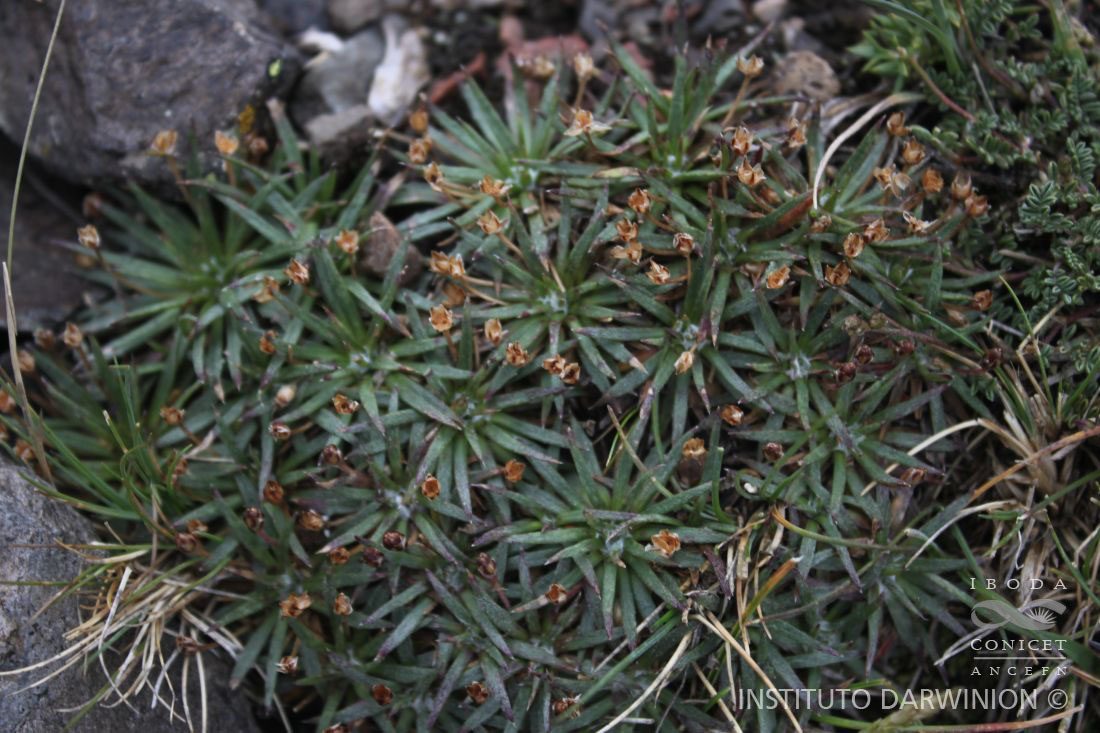 Hierbas perennes, formando grandes cojines o montículos hasta de 0,1 m de alto; raíz primaria de 0,2-1 cm de diámetro, prominente. Hojas arrosetadas, alternas; láminas lineares a linear-lanceoladas, de 1-29 × 0,01-0,02 cm, ápice acuminado o cuspidado, base atenuada formando un pseudopecíolo, margen entero, pubescencia tenue de pelos antrorsos o bien glabrescentes en ambas caras. Flores solitarias, raramente 2, dispuestas en el ápice de un escapo erecto, de 0,3-5 cm de largo, terete, glabrescente a piloso con tricomas generalmente adpresos; brácteas 2, de 1,7-3,8 mm de largo, ovadas, acuminadas; cáliz con sépalos connados sólo en la base, elípticos, de 3-4 mm de largo, acuminados, nervio medio glabro; corola con el tubo glabro, lóbulos ovados, de 1-2 mm de largo, margen involuto; estambres 4, exertos. Pixidio elipsoide a ovoide, de 3-4 mm de largo, 1-7 seminado. Semillas elipsoides, de 1-2,6 mm de largo, plano-convexas, testa rugosa y opaca. Cojines leñosos; escapos superando la longitud de las hojas.