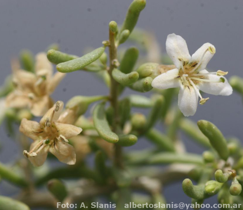 Arbustos halófilos de 0,6-1,8 m de alto; tallos castaño-claros, con espinas hasta de 35 mm, glabros, ramificados, con abundantes ramas espiniformes rígidas. Hojas carnosas, cilindráceas a levemente aplanadas, de sección circular o elíptica, con la nervadura principal inmersa, glabras o con algunos pelos glandulares esparcidos; láminas lineares o linear-obovadas, de 2-15 × 0, 5- 1,5(-2) mm, atenuadas en la base, normalmente obtusas en el ápice, solitarias, por lo general arrugadas cuando secas. Flores 5-meras, raro 6-meras; cáliz acopado, glabro, con algunos pelos simples en el ápice de los lóbulos y en el margen, 2-3-labiado y zigomorfo o bien 4-5-dentado y actinomorfo, con lóbulos más chicos que el tubo; tubo de 2-4 mm, lóbulos subtriangulares de 0,5-2 mm; corola lilacina o blanquecina, a veces con nervaduras atropurpúreas en el haz de los lóbulos y hacia dentro del tubo, angostamente infundibuliforme, glabra en su exterior, pilosa en su interior, formando un anillo pubescente en la zona de inserción estaminal, tubo de 5-10 × 2-3 mm, lóbulos elípticos de 2,2-4 × 2-3 mm; estambres adheridos al tubo corolino más arriba de su hemialtura, filamentos subiguales, muy exertos, levemente geniculados y pubescentes en su base; ovario con nectario basal inconspicuo y verde, estilo muy exerto. Baya roja o atropurpúrea, subglobosa, de 4-5 × 3-4 mm; semillas reniformes o poliédricas, 3 a 15 por lóculo; episperma con celdillas de paredes onduladas, marcadas.