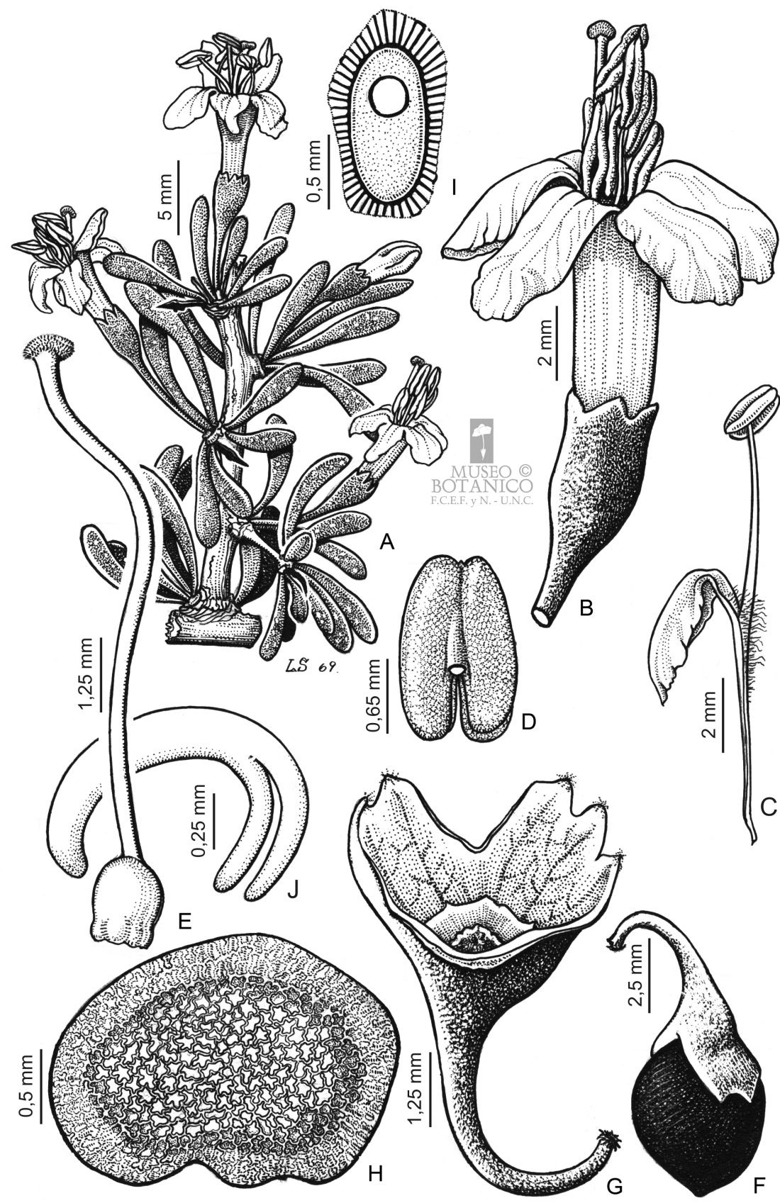 A. Rama florífera. B. Flor. C. Sector de corola con un estambre y un lóbulo corolino. D. Antera. E. Gineceo. F. Fruto. G. Cáliz fructífero. H. Semilla. I. Semilla, corte transversal. J. Embrión.
