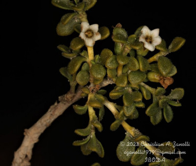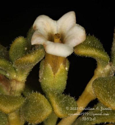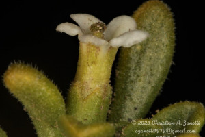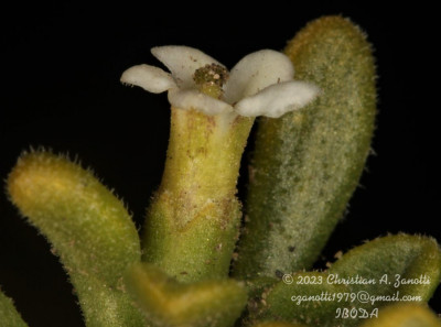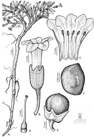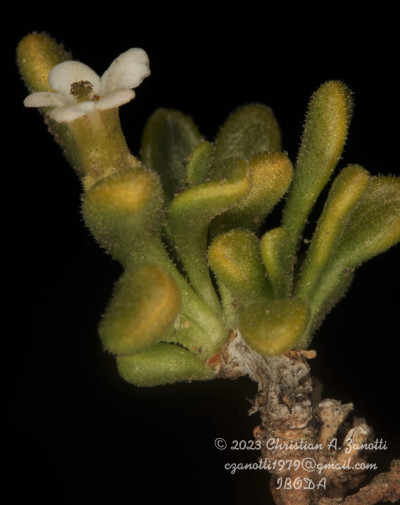 Arbustos enanos, postrados o ascendentes, hasta de 25 cm de alto; tallos amarillo-grisáceos o castaño-oscuros, inermes, ramificados, con ramas subterráneas estoloníferas, pubescentes cuando jóvenes, con pelos ramificados y simples, tardíamente glabros. Hojas solitarias o fasciculadas; láminas espatuladas u obovadas, de 2-27 × 1-5 mm, gradualmente atenuadas en la base, carnósulas, pubescentes (con pelos simples, ramificados y glandulares), glabrescentes o glabras, por lo general con cilias en el borde. Flores 5-meras, solitarias; cáliz tubuloso, a veces algo acampanado, 5-dentado, con dientes por lo común subiguales, a veces desiguales, siempre más cortos que el tubo, glabro o densamente pubescente, tubo de 2-3,5 mm, lóbulos de 1-2 mm, ciliados en el borde; corola blanca o rosada, con manchas pardo- rojizas o violáceas en el interior del tubo, infundibuliforme, glabra a muy pubescente en su exterior, casi siempre glabérrima en su interior, por excepción de unos pocos pelos simples esparcidos, tubo de 5-8(-9) × 3-5 mm, lóbulos ovales de 2-3,5 × 2-3 mm, ciliados en el borde, desplegados a levemente revolutos en antesis; estambres adheridos al tubo corolino en su tercio medio, filamentos subiguales, poco exertos, glabérrimos; ovario con nectario rojo-anaranjado, prominente. Baya subglobosa, anaranjada, ca. 8 × 10 mm; semillas 11 a 15 por lóculo, irregulares, poliédricas, de 2,5-3,5 × 2-2,5 mm; episperma liso o con celdillas de paredes onduladas, más o menos marcadas.