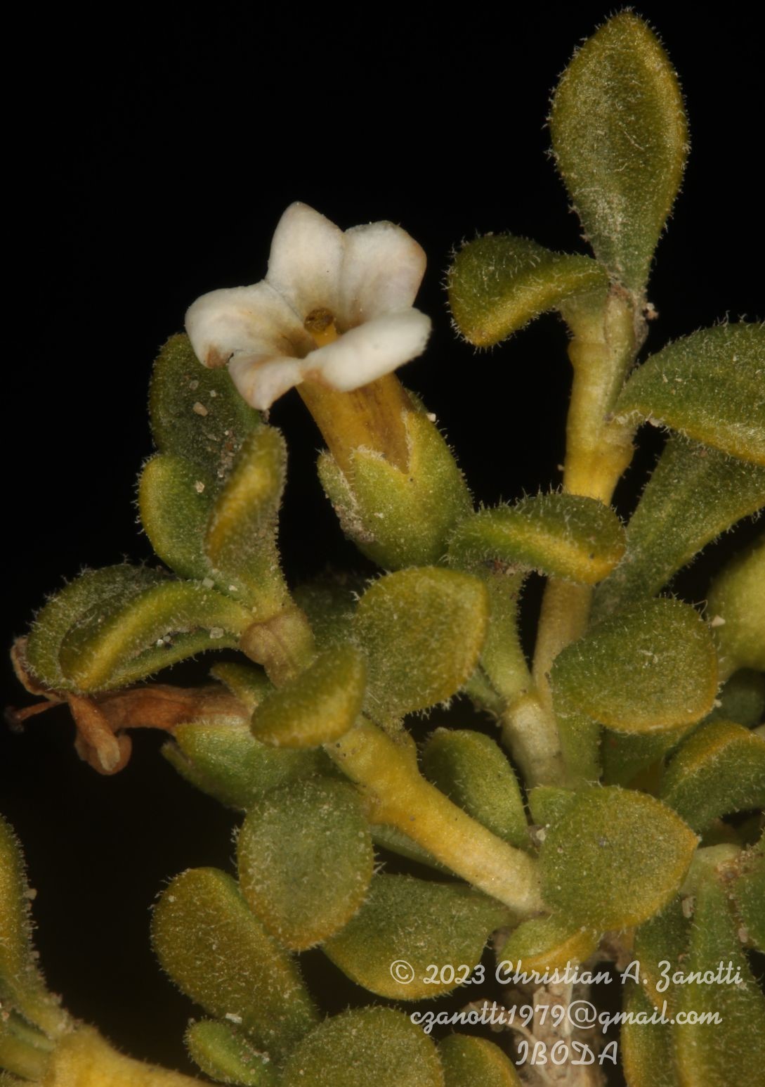 Arbustos enanos, postrados o ascendentes, hasta de 25 cm de alto; tallos amarillo-grisáceos o castaño-oscuros, inermes, ramificados, con ramas subterráneas estoloníferas, pubescentes cuando jóvenes, con pelos ramificados y simples, tardíamente glabros. Hojas solitarias o fasciculadas; láminas espatuladas u obovadas, de 2-27 × 1-5 mm, gradualmente atenuadas en la base, carnósulas, pubescentes (con pelos simples, ramificados y glandulares), glabrescentes o glabras, por lo general con cilias en el borde. Flores 5-meras, solitarias; cáliz tubuloso, a veces algo acampanado, 5-dentado, con dientes por lo común subiguales, a veces desiguales, siempre más cortos que el tubo, glabro o densamente pubescente, tubo de 2-3,5 mm, lóbulos de 1-2 mm, ciliados en el borde; corola blanca o rosada, con manchas pardo- rojizas o violáceas en el interior del tubo, infundibuliforme, glabra a muy pubescente en su exterior, casi siempre glabérrima en su interior, por excepción de unos pocos pelos simples esparcidos, tubo de 5-8(-9) × 3-5 mm, lóbulos ovales de 2-3,5 × 2-3 mm, ciliados en el borde, desplegados a levemente revolutos en antesis; estambres adheridos al tubo corolino en su tercio medio, filamentos subiguales, poco exertos, glabérrimos; ovario con nectario rojo-anaranjado, prominente. Baya subglobosa, anaranjada, ca. 8 × 10 mm; semillas 11 a 15 por lóculo, irregulares, poliédricas, de 2,5-3,5 × 2-2,5 mm; episperma liso o con celdillas de paredes onduladas, más o menos marcadas.
