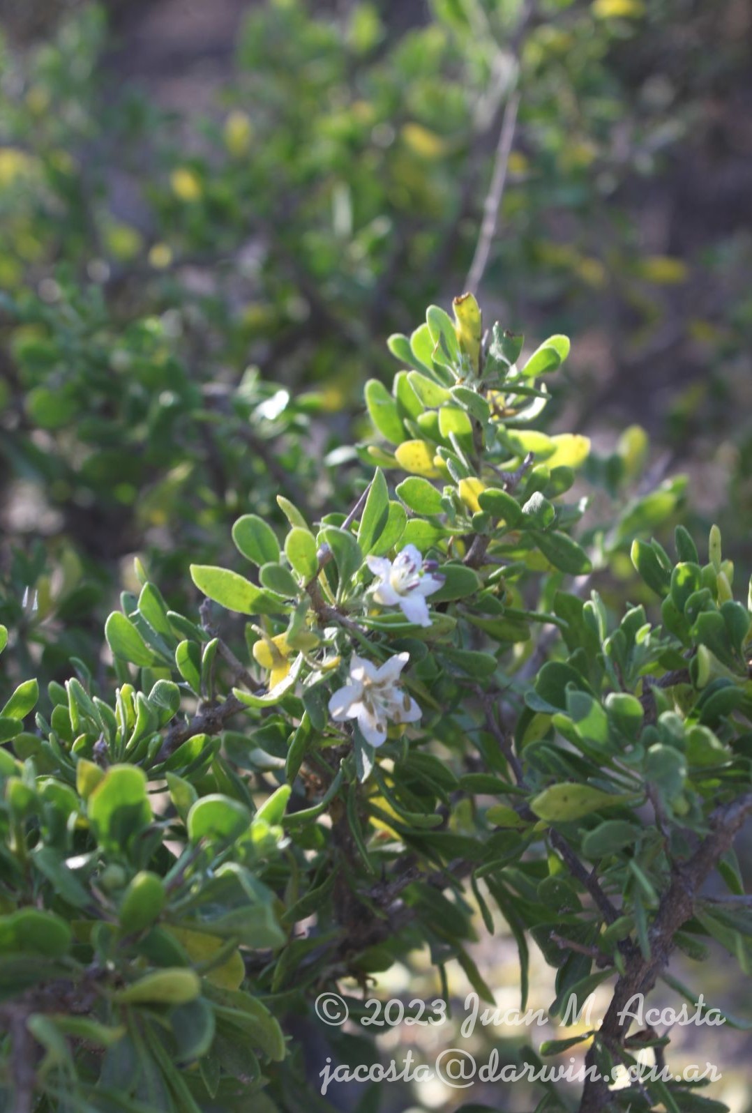 Arbustos de 0,5-2 m de alto; tallos caoba oscuros o castañoamarillentos, lisos, brillantes, glabros, ramificados, por lo común en zig-zag, y con ramas espiniformes algo arqueadas, con espinas ca. 7 mm. Hojas pecioladas, planas; láminas obovadas, espatuladas, elípticas o suborbiculares, de 4-25 × 2-11 mm, con el ápice obtuso, carnósulas, pruinosas, glabras o con algunos tricomas glandulares esparcidos. Flores 5(-6)-meras, solitarias, zigomorfas; cáliz tubuloso o acampanado, 5-6-dentado o bilabiado, glabro, con algunos pelos simples y glandulares en el ápice de los lóbulos, tubo de 5-8,5 mm, lóbulos subtriangulares de 1-3 mm, mucho más cortos que el tubo; corola ampliamente infundibuliforme, glabra por fuera y pubescente por dentro en la zona de inserción de los estambres, tubo de 8,5-12 × 4-7 mm, lóbulos obovados de 3,5-5 × 4- 5 mm, obtusos, usualmente desplegados en la antesis; estambres adheridos al tubo corolino en su tercio basal, filamentos subiguales o poco desiguales, exertos, densamente pubescentes en su base; ovario con nectario diferenciado, prominente, estilo muy exerto. Baya envuelta por el cáliz acrescente, ovoide, ca. 6 × 5 mm, con su zona apical fuertemente esclerosada, con dos casquetes contiguos en forma de gajos de naranja que ocupan el cuarto apical del fruto; semillas ca. 30 por lóculo, irregulares, poliédricas, con los bordes algo doblados; episperma más o menos liso, con celdillas poco marcadas.