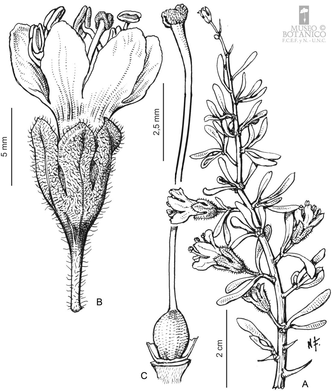 A. Rama florífera. B. Flor. C. Gineceo y ciatio seccionado en su mitad anterior.