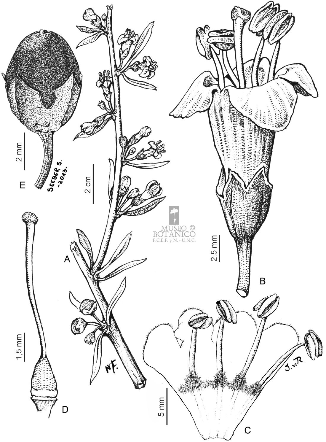 A. Rama florífera. B. Flor. C. Corola desplegada. D. Gineceo. E. Fruto.