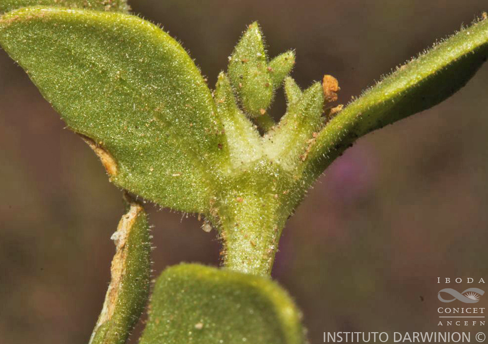 Hierbas anuales, decumbentes y glanduloso-pubescentes; tallos hasta de 50 cm de largo. Pecíolos de 3-15 mm; láminas ovado-rómbicas, de 15-25 × 10-20 mm. Flores sésiles, 2 por nudo; cáliz ca. 4,5 mm, lóbulos foliáceos, 3 menores brevísimos (o uno hasta de 1 mm), 2 mayores, subiguales (uno de 2-3 × 1 mm y el otro de 2 × 0,5 mm); corola blanca, ca. 7 mm, limbo breve ca. 5 mm de diámetro; par inferior de estambres de 2,5 mm, el par superior de 2 mm y el impar de 1,75 mm; filamentos con algunos tricomas eglandulares simples, anteras ca. 0,5 mm de diámetro; gineceo ca. 4 mm. Fruto ca. 5 × 2 mm, concrescente con la axila; cáliz fructífero 5-nervado, lóbulos foliáceos; semillas de 3,5-4 × 1,25 mm; embrión recto o levemente curvo.