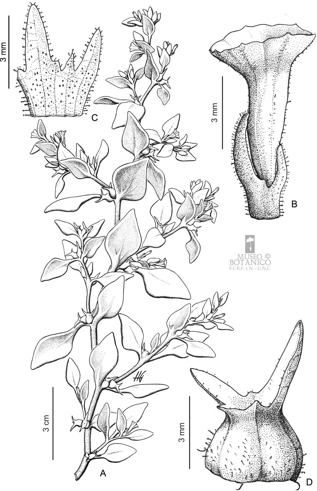 Hierbas anuales, decumbentes y glanduloso-pubescentes; tallos hasta de 50 cm de largo. Pecíolos de 3-15 mm; láminas ovado-rómbicas, de 15-25 × 10-20 mm. Flores sésiles, 2 por nudo; cáliz ca. 4,5 mm, lóbulos foliáceos, 3 menores brevísimos (o uno hasta de 1 mm), 2 mayores, subiguales (uno de 2-3 × 1 mm y el otro de 2 × 0,5 mm); corola blanca, ca. 7 mm, limbo breve ca. 5 mm de diámetro; par inferior de estambres de 2,5 mm, el par superior de 2 mm y el impar de 1,75 mm; filamentos con algunos tricomas eglandulares simples, anteras ca. 0,5 mm de diámetro; gineceo ca. 4 mm. Fruto ca. 5 × 2 mm, concrescente con la axila; cáliz fructífero 5-nervado, lóbulos foliáceos; semillas de 3,5-4 × 1,25 mm; embrión recto o levemente curvo.