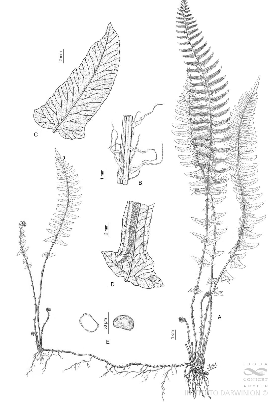 Plantas terrestres. Rizomas erectos a oblicuos, estoloníferos, con escamas lanceoladas, castaño oscuras, brillantes. Frondes subdimórficas hasta de 65 cm de largo, las fértiles algo mayores que las estériles; pecíolos castaños, escamosos; láminas ovadas a ovado-lanceoladas, pinnadas, subcoriáceas, con 35-50 pares de pinnas; pinnas de 2-4 x 0,9-1,3 cm, las basales con base contraída, suborbicular-deltoide a trilobadas, pinnas medias rectas a falcadas con base contraída y con 2 aurículas mucronadas, glabras o con algunas escamas piliformes. Venas laterales simples a 1 furcadas. Cenosoros medios a submarginales, continuos o interrumpidos, indusios con márgenes erosos. Esporas con perisporio liso, delgado, fácilmente desprendible.