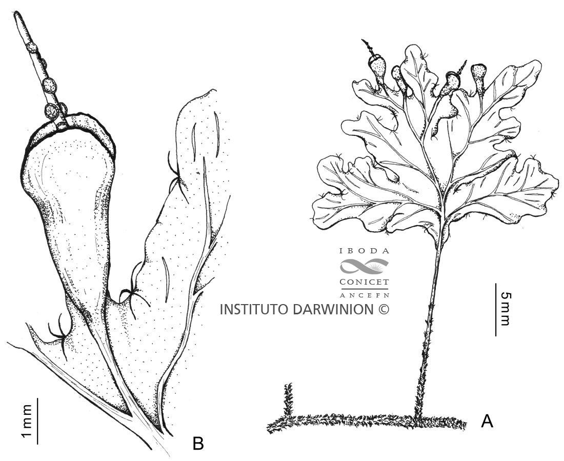 Rizomas largamente rastreros, cubiertos por pelos negruzcos. Frondes remotas, subsésiles o cortamente pecioladas, de (0,5-)1-3,5 × 1,5 cm; pecíolos con la base cubierta por los mismos pelos que los rizomas; láminas ovadas a elípticas, las jóvenes a menudo subreniformes, pinnatífidas; pinnas lobuladas, con tricomas oscuros, simples a bífidos sobre el margen y estrellados en los senos foliares; retículo celular de la lámina con células isodiamétricas; falsas venillas escasas, situadas entre las venas verdaderas. Soros ubicados próximos al ápice de la lámina, notablemente exertos, sólo con la base inmersa en el tejido fotosintético; indusios no alados, o con un ala muy estrecha, cónicos, bilabiados, usualmente más anchos que largos; receptáculos notablemente exertos.