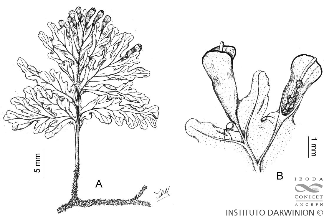 Rizomas largamente rastreros, densamente cubiertos por pelos negruzcos. Frondes remotas, subsésiles o cortamente pecioladas, de 2-8 cm de largo; pecíolos de 0,5-1,4 cm de largo, con la base cubierta por los mismos pelos que el rizoma, a veces pilosos en toda su extensión; láminas de contorno elíptico, ovado u obovado, 1-2-pinnatífidas, de 2-3 × 1- 1,6 cm; raquis bien diferenciados, a menudo con pelos oscuros en la cara abaxial, al menos cerca de la base; pelos simples y bífidos en el margen foliar, estrellados en los senos foliares o sobre los dientes; segmentos angostos; falsas venillas escasas cercanas o subparalelas al margen. Soros terminales sobre los segmentos de la parte apical de la lámina, uno a varios por lámina, parcial o profundamente inmersos en ella, alados; indusios cónicos, bilabiados, con labios más anchos que el tubo, de márgenes oscuros; receptáculo exerto.