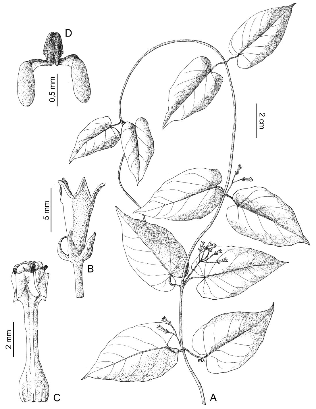 Voluble, con tallos de 5-6 m de altura. Hojas con pecíolo de 1-5 cm de largo; lámina ovado-lanceolada, de 3-10 × 1-4 cm, de base cordada, ápice largamente acuminado, con tricomas cortos, esparcidos en ambas caras. Inflorescencias umbeliformes, compuestas, multifloras, con pedúnculo de 6-8 cm de largo, pubescente. Flores con pedicelo de 8-10 mm de largo, pubescente; cáliz con lóbulos linear-lanceolados, de 5 × 1,2 mm, finamente pubescentes en ambas caras y con coléteres debajo del seno interno; corola con tubo obcónico-subcilíndrico, de 5 mm de largo, superficie externa finamente pubescente, superficie interna glabra, lóbulos subtriangulares de 3 × 1,5 mm, cara abaxial finamente pubescente, cara adaxial glabra; ginostegio largamente estipitado, de 5 mm de alto, estípite de 3,5 mm de alto; anteras de 1,5 mm de largo, con membrana apical suborbicular, de 0,5 × 0,8 mm; polinario con el retináculo obovoide, de 0,4 × 0,25 mm, caudículas subhorizontales de 0,1 mm de largo, con margen hialino inferior; polinios de contorno oblongo, de 0,58 × 0,25 mm. Folículos y semillas no vistos.