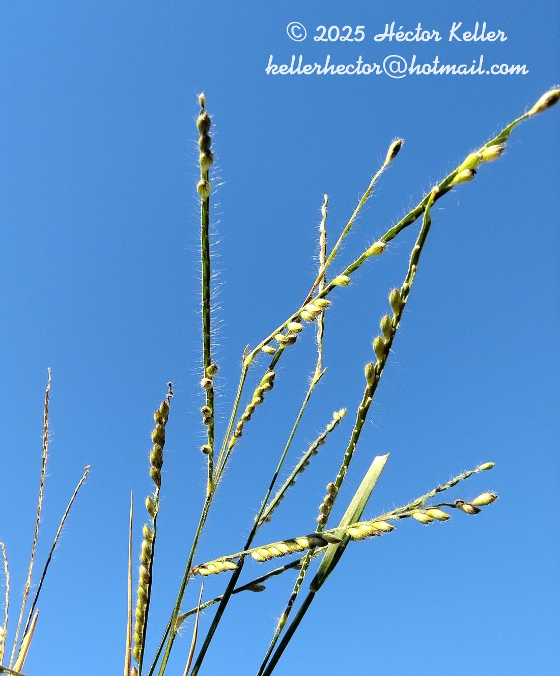 Plantas perennes de 1-2 m de alto, con rizomas cortos, glabras a esparcidamente pilosas; cañas erectas, raramente geniculadas, simples, a veces ramificadas, cilíndricas, huecas, multinodes, entrenudos de 9-20 cm de largo, estriados, glabros a pilosos hacia el ápice; nudos glabros, comprimidos, castaños; vainas de 7-15 cm de largo, generalmente más cortas que los entrenudos, estriadas, glabras a híspidas entre los nervios, de bordes membranáceos; lígulas de base cortamente membranácea, luego largamente pestañosa, de 1-2 mm de largo, arqueadas; láminas linear-lanceoladas, de 9-40 cm x 8- 15 mm, base subrecta y ápice largamente atenuado, glabras a cortamente híspidas en ambas caras, los márgenes cartilaginosos, escabrosos, involutos. Inflorescencias bilaterales, exertas, de 8-18 cm de largo, terminales; eje principal con 1-7 ramificaciones de primer orden racemosas, dístico-alternas, ascendentes, divergentes del eje principal, arqueadas; raquis de las ramificaciones filiforme, cortamente alado, de 4-16 cm x 0,5-0,8 (-1) mm, márgenes con pelos de base tuberculada, pestañosos, escabrosos, terminando en una espiguilla desarrollada; pedicelos ca. 0,6 mm de largo, angulosos, finamente escabrosos en los ángulos; espiguillas dispuestas unilateralmente en una serie, ocasionalmente en 2 series hacia la base de las ramificaciones, solitarias, imbricadas. Espiguillas ovoides a elipsoidales, de 4,2-5,4 x 1,8-2,1 mm, de ápice obtuso, con un breve estípite ca. 0,5 mm de largo, pajizas o con tintes purpúreos, glabras a pilosas hacia el ápice; gluma superior y lemma inferior subiguales, con los nervios conspicuos en la porción distal, gluma inferior ovada, de 1,8-2,4 mm de largo, ?-½ del largo de la espiguilla, adaxial, membranácea, glabra, abrazadora, 9-11-nervia, con los nervios anastomosados junto al ápice, gluma superior de 3,6-3,9 mm de largo, glabra a pilosa hacia el ápice, membranácea, 7-nervia, dorso convexo, dejando libre la porción apical del antecio superior; gluma inferior y superior separadas por un conspicuo entrenudo ca. 0,5 mm de largo; lemma inferior de 3,9-4,2 mm de largo, membranácea, glabra a pilosa hacia la porción apical, de dorso plano, 5-nervia, pálea inferior de 3,3-3,9 x 1,8 mm de ancho, hialina, glabra; flor inferior estaminada, lodículas 2, ca. 0,3 mm de largo; estambres 3, anteras de 2,5 mm de largo; antecio superior elipsoide, de 3,3-3,9 x 1,7-2 mm, cortamente crestado, plano-convexo, pajizo, rígido, finamente estriada; lemma de dorso marcadamente convexo; pálea biaquillada, de márgenes involutos, lisos y lustrosos; lodículas similares a las de la flor inferior; estambres 3, anteras de 2,4 mm de largo.