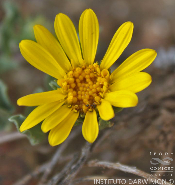 Subarbustos ca. 15 cm de alto. Tallos postrados o semierectos, glabros o pubescentes. Hojas sésiles, polimorfas, por lo común irregularmente lobuladas, también dentadas y pinnatisectas, de 15-20 × 2-12 mm, de ápice agudo, con tricomas simples y/o glandulares estipitados, escasos a numerosos, en ambas caras de la lámina y con tricomas cortos, rígidos, curvos, en los márgenes. Capítulos radiados, de 20-30 mm de diámetro. Involucro de 6-7 mm de alto, con 7 series de filarios subiguales, los externos lineares con la base ensanchada, de 4-6,5 × 0,3-0,5 mm, acuminados, a veces con tricomas simples y tricomas glandulares estipitados en la porción proximal o en toda su superficie; los internos elípticos, de 5-7 × 1,5 mm, acuminados, con tricomas glandulares estipitados en toda su superficie. Flores dimorfas, las marginales con corola ligulada, limbo elíptico, ápice entero, de 12-15 × 2,3-3,5 mm; las del centro con corola tubulosa de 4-5 mm de largo. Aquenios prismáticos de 2,5-3 mm de largo. Papus formado por ca. 4 aristas subcapilares con un borde plano, escasamente ciliadas, de 3,5 mm de largo.