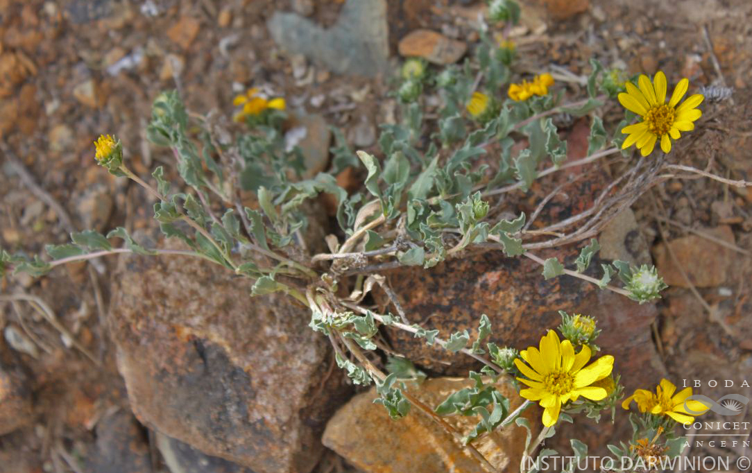 Subarbustos ca. 15 cm de alto. Tallos postrados o semierectos, glabros o pubescentes. Hojas sésiles, polimorfas, por lo común irregularmente lobuladas, también dentadas y pinnatisectas, de 15-20 × 2-12 mm, de ápice agudo, con tricomas simples y/o glandulares estipitados, escasos a numerosos, en ambas caras de la lámina y con tricomas cortos, rígidos, curvos, en los márgenes. Capítulos radiados, de 20-30 mm de diámetro. Involucro de 6-7 mm de alto, con 7 series de filarios subiguales, los externos lineares con la base ensanchada, de 4-6,5 × 0,3-0,5 mm, acuminados, a veces con tricomas simples y tricomas glandulares estipitados en la porción proximal o en toda su superficie; los internos elípticos, de 5-7 × 1,5 mm, acuminados, con tricomas glandulares estipitados en toda su superficie. Flores dimorfas, las marginales con corola ligulada, limbo elíptico, ápice entero, de 12-15 × 2,3-3,5 mm; las del centro con corola tubulosa de 4-5 mm de largo. Aquenios prismáticos de 2,5-3 mm de largo. Papus formado por ca. 4 aristas subcapilares con un borde plano, escasamente ciliadas, de 3,5 mm de largo.