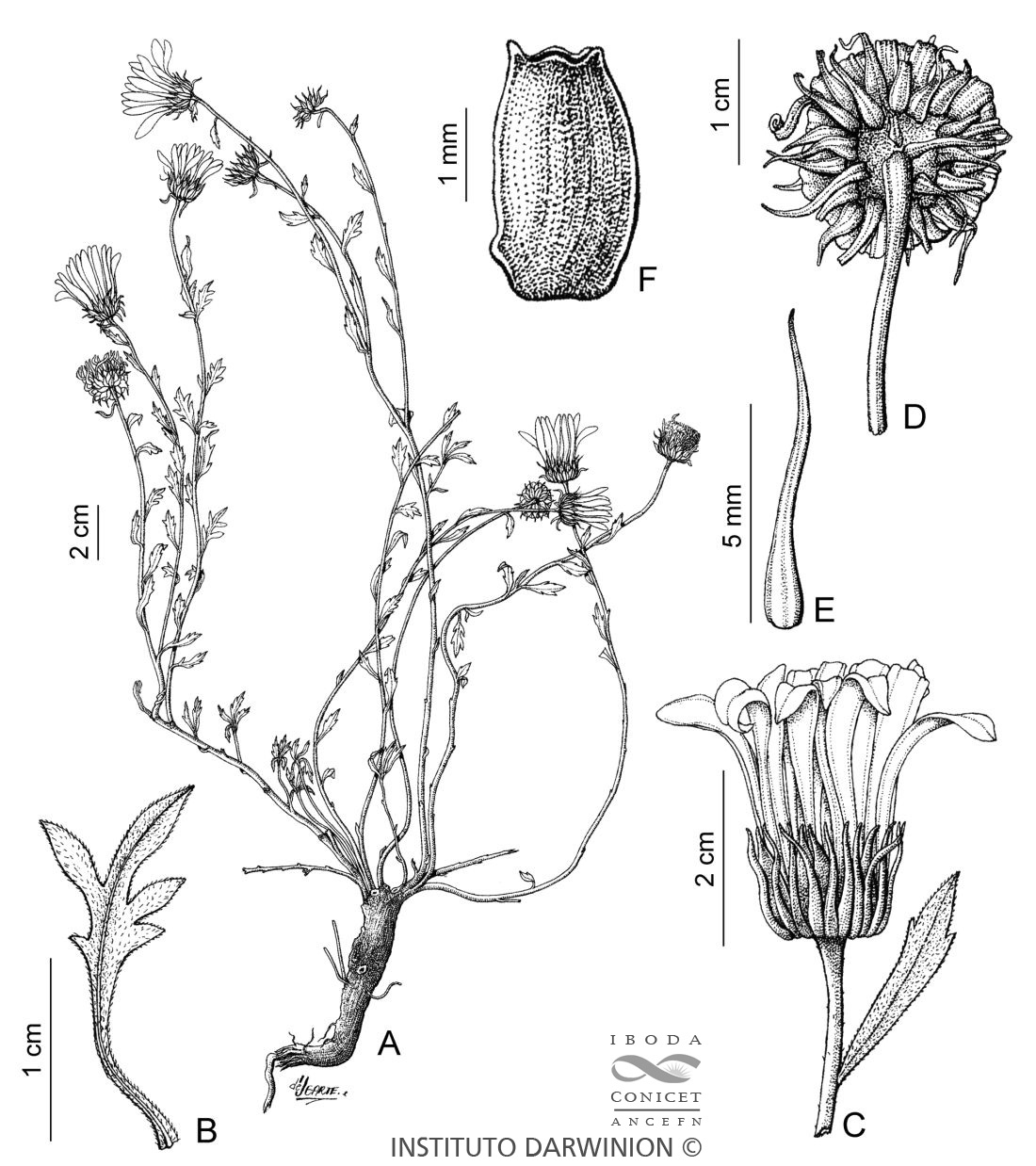 Subarbustos ca. 15 cm de alto. Tallos postrados o semierectos, glabros o pubescentes. Hojas sésiles, polimorfas, por lo común irregularmente lobuladas, también dentadas y pinnatisectas, de 15-20 × 2-12 mm, de ápice agudo, con tricomas simples y/o glandulares estipitados, escasos a numerosos, en ambas caras de la lámina y con tricomas cortos, rígidos, curvos, en los márgenes. Capítulos radiados, de 20-30 mm de diámetro. Involucro de 6-7 mm de alto, con 7 series de filarios subiguales, los externos lineares con la base ensanchada, de 4-6,5 × 0,3-0,5 mm, acuminados, a veces con tricomas simples y tricomas glandulares estipitados en la porción proximal o en toda su superficie; los internos elípticos, de 5-7 × 1,5 mm, acuminados, con tricomas glandulares estipitados en toda su superficie. Flores dimorfas, las marginales con corola ligulada, limbo elíptico, ápice entero, de 12-15 × 2,3-3,5 mm; las del centro con corola tubulosa de 4-5 mm de largo. Aquenios prismáticos de 2,5-3 mm de largo. Papus formado por ca. 4 aristas subcapilares con un borde plano, escasamente ciliadas, de 3,5 mm de largo.