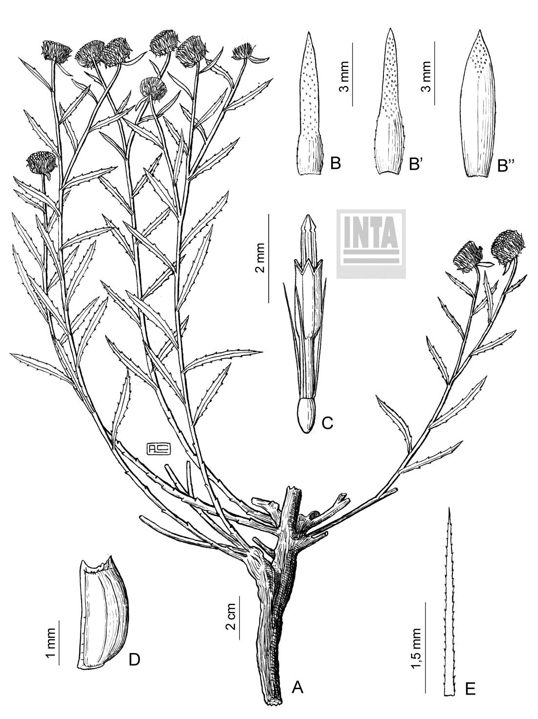 A. Planta. B. Porción de tallo. C. Filario externo. D. Filario medio. E. Filario interno. F. Flor del margen. G. Flor del centro. H. Arista del papus.