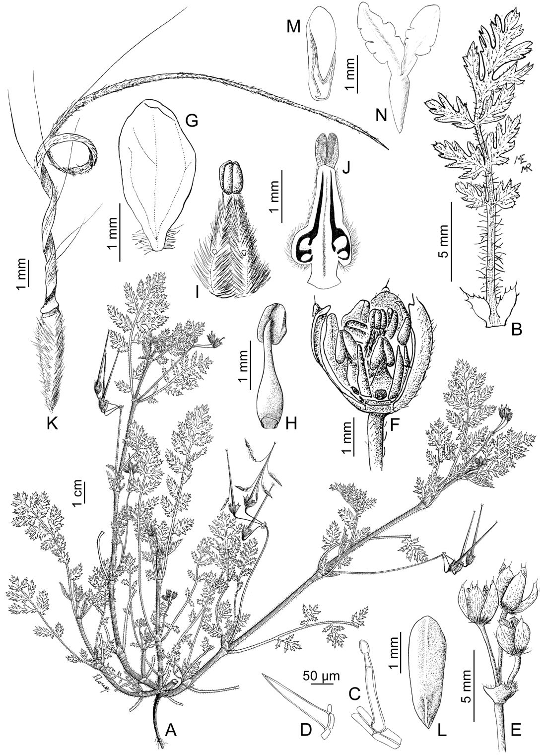 A. Rama fructífera. B. Hoja. C. Detalle de un tricoma glandular del cáliz. D. Detalle de un tricoma simple de la estípula. E. Infl orescencia. F. Flor, con dos sépalos, dos pétalos y dos anteras removidas. G. Pétalo. H. Estambre, vista dorsal. I. Gineceo. J. Gineceo, corte longitudinal. K. Mericarpo. L. Semilla, cara ventral. M. Embrión. N. Embrión desplegado.