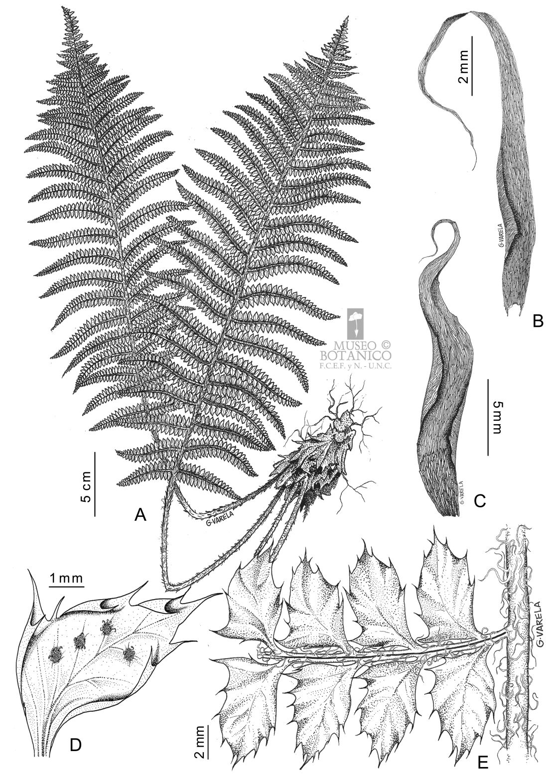 A. Planta. B. Escama del raquis. C. Escama del pecíolo. D. Envés de una pínnula. E. Porción basal de una pinna, vista adaxial, mostrando las pínnulas y el indumento.