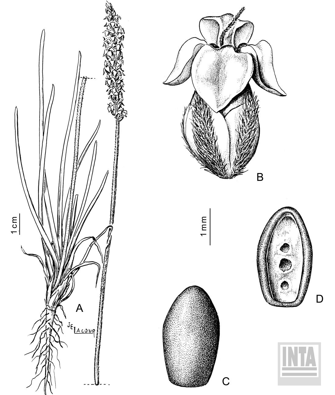 Hierbas cespitosas, perennes, de 0,2-0,3 m de alto; raiz fusiforme, leñosa; en ocasiones con tallos ascendentes leñosos. Hojas alternas; láminas lineares a linear-lanceoladas, de 8-20 × 0,1-0,7 cm, pubescentes a glabrescentes en ambas caras, ápice agudo, base foliar dilatada, vaginante, usualmente lanosa. Espigas cilíndricas, multifloras, de 3-10 cm de largo; escapos erectos o ascendentes, sobrepasando el nivel de las hojas, de 2- 3,5 cm de largo, densamente pubescentes con tricomas antrorsos, especialmente en la porción distal. Flores en la axila de una bráctea ovado-elíptica, de 3-5 mm de largo, velluda en el ápice; cáliz con sépalos connados sólo en la base, de 4-4,5 mm de largo, los anteriores ovados, de 2 mm de ancho, ápice emarginado y pubescente; corola con el tubo glabro, de 4-5 mm de largo, limbo con óvulos reflexos, de 3,75-4 mm de largo; estambres 4, exertos. Pixidio ovoide, 2-seminado, de 3-4,2 mm de largo. Semillas elipsoides, de 2,5-3,5 cm de largo, pardas.