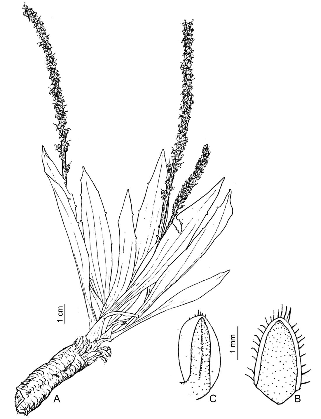 Hierbas perennes, hasta de 0,3 m de alto; raíz primaria muy engrosada, conspicua, indivisa, raíces secundarias profusas, extensas, carnosas. Hojas arrosetadas, alternas; láminas elípticas a elíptico-lanceoladas, de 10-27 × 0,9-3 cm, glabras en ambas caras, ápice agudo a obtuso, base atenuada formando un pseudopecíolo, margen ligeramente dentado, 5-nervadas. Espigas cilíndricas, multifloras, de 4-15 cm de largo, más laxas en la porción inferior; escapos erectos, de 10-27 cm de largo, glabrescentes a pilosos con tricomas patentes, más densos en la porción distal. Flores en la axila de una bráctea ovada, de 3-3,5 mm de largo, margen ciliado a glabrescente; cáliz con sépalos connados sólo en la base, ovados, hasta de 3 mm de largo; corola con el tubo glabro, hasta de 4 mm de largo, lóbulos ovados, de 2-2,5 mm de largo, ápice agudo; ovario con 2 óvulos. Pixidio 1-seminado, elipsoide. Semillas de 2,3-3 mm de largo, cóncavas en el centro, testa foveolada.