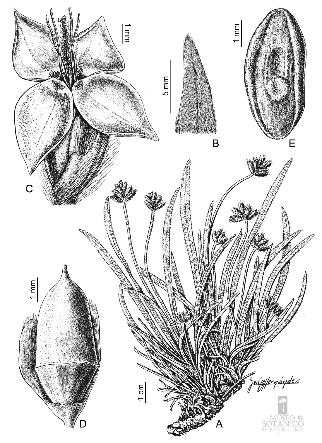 A. Planta B. Detalle de la porción apical de la hoja. C. Flor. D. Pixidio. F. Semilla, cara placental.